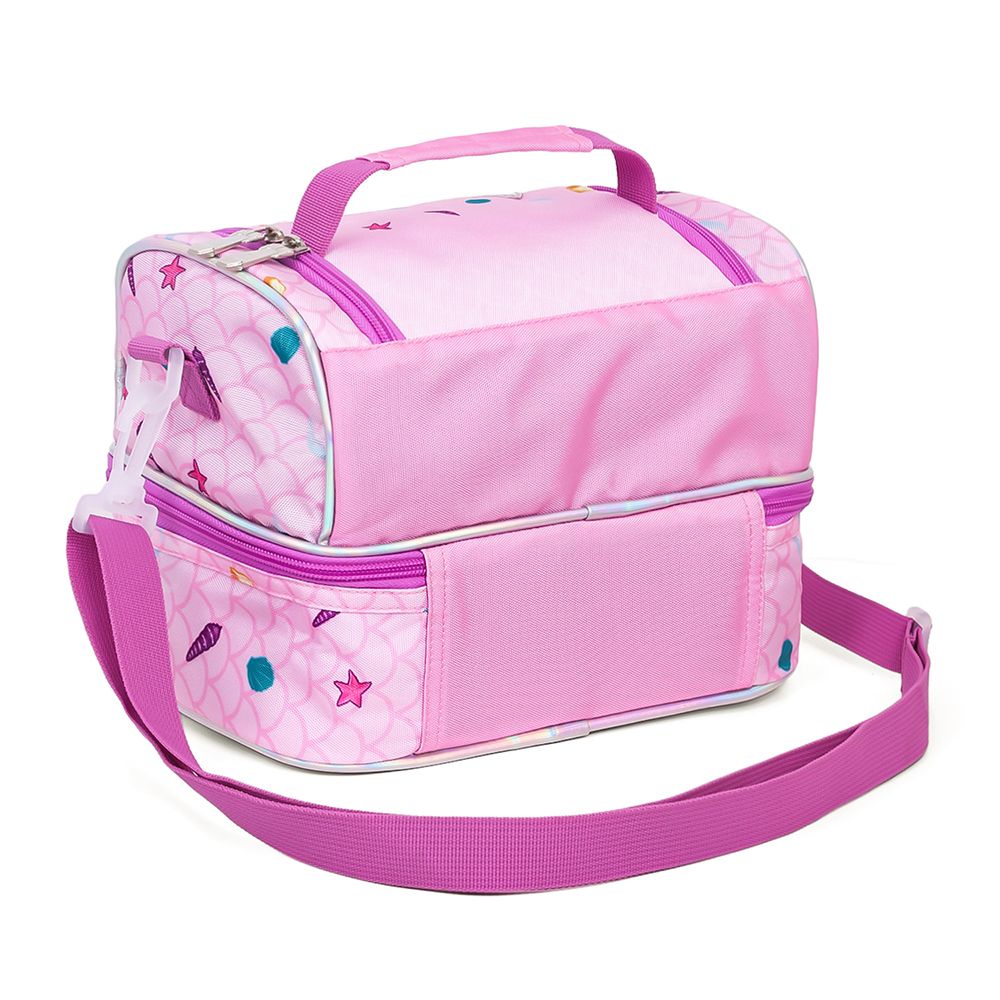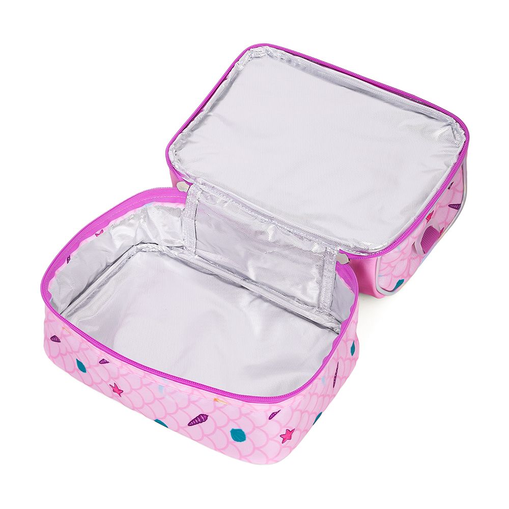 Turn lunchtime into a magical moment with the Eazy Kids Dual Compartment Lunch Bag in Mermaid Edition. This glittery 3D chrome-themed lunch bag includes two insulated sections to store both hot and cold food separately, protected by EPE foam padding. Built from dirt-proof, easy-to-clean material, it also features colorful zippers and an adjustable/removable strap to convert it into a crossbody, shoulder bag, or handheld. A fun and functional choice for every mermaid-loving kid.