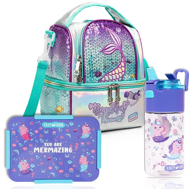 Back to school is back to fun now, because Eazy Kids Back to School combo are especially designed for your kid to make them happy. comes with Eazy Kids Similar color with Similar Prints makes a great Back to School Combo! Eazy Kids Mermaid Princess Lunch bag is a beautiful innovative Lunch bag which will add to your girl's collection! The first instant you will fall in love with the sequined and chrome colors which imitates the mermaid look.