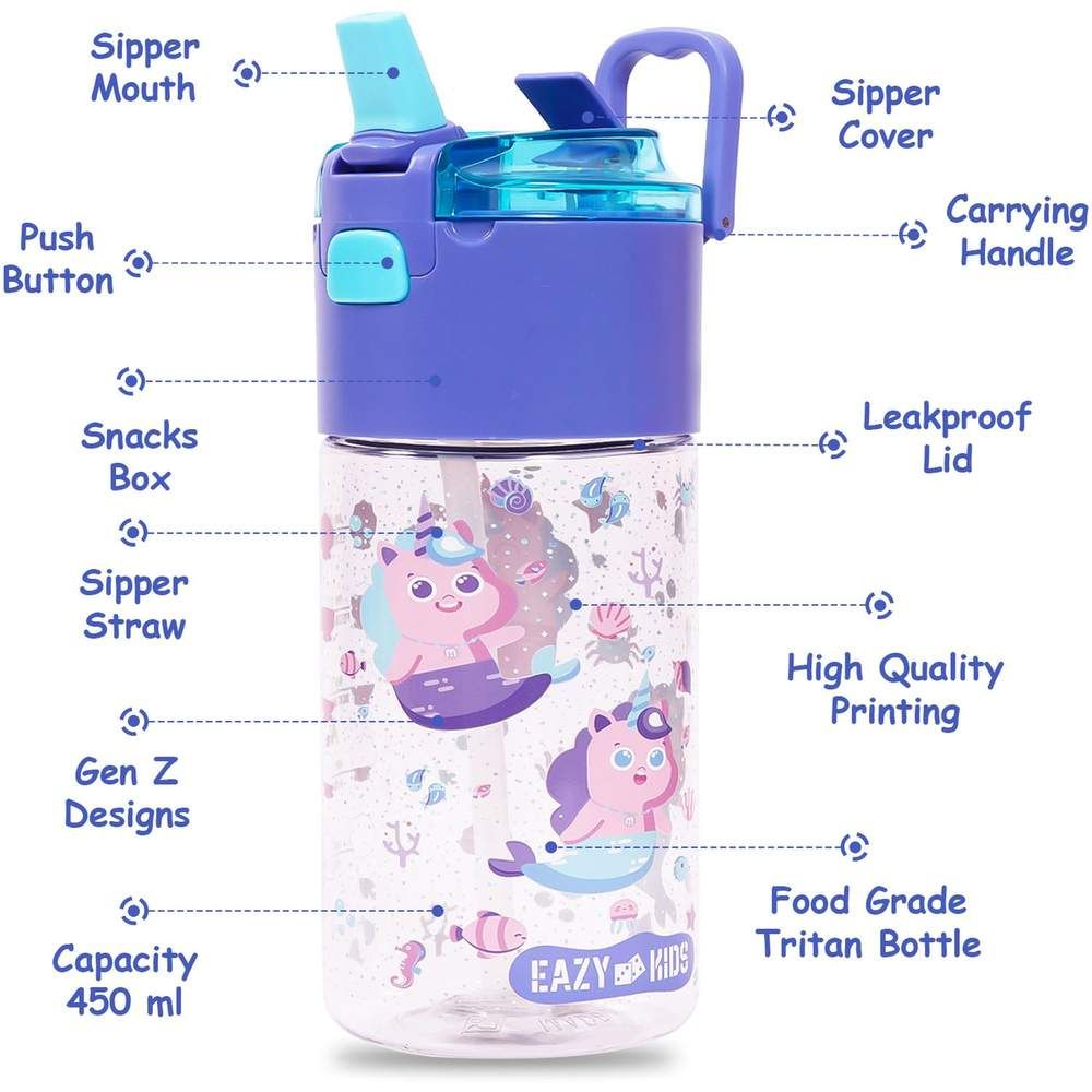 We make Hydration and Meal time fun! Fill Up your kids day with Eazy Kids Meal Box and Eazy Kids Drinkware Water Bottle . Eazy Kids Lunch Box and Tritan Water Bottle made with BPA and Phthalates Free material non-toxic, food grade & eco-friendly. The Capacity of Water Bottle is 450ml to keep your Kid full day hydrated and Tiffin Box is 850ml for a Balanced Nutritious Meals, Lunch Box comes with 4 Clasp lock & Both Sipper and Lunch Box are lined with silicon which makes it completely leakproof.