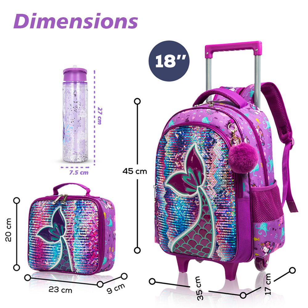 Product Dimensions: Trolley: 35 x 17 x 45 cm Lunch Bag: 20 x 23 x 9 cm Water Bottle: 7.5 x 10.8 x 27 cm Pencil Case: 22 x 9 x 9 cm