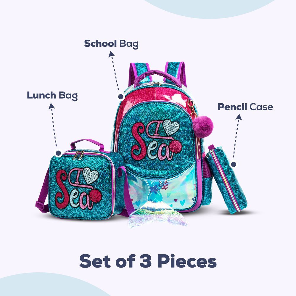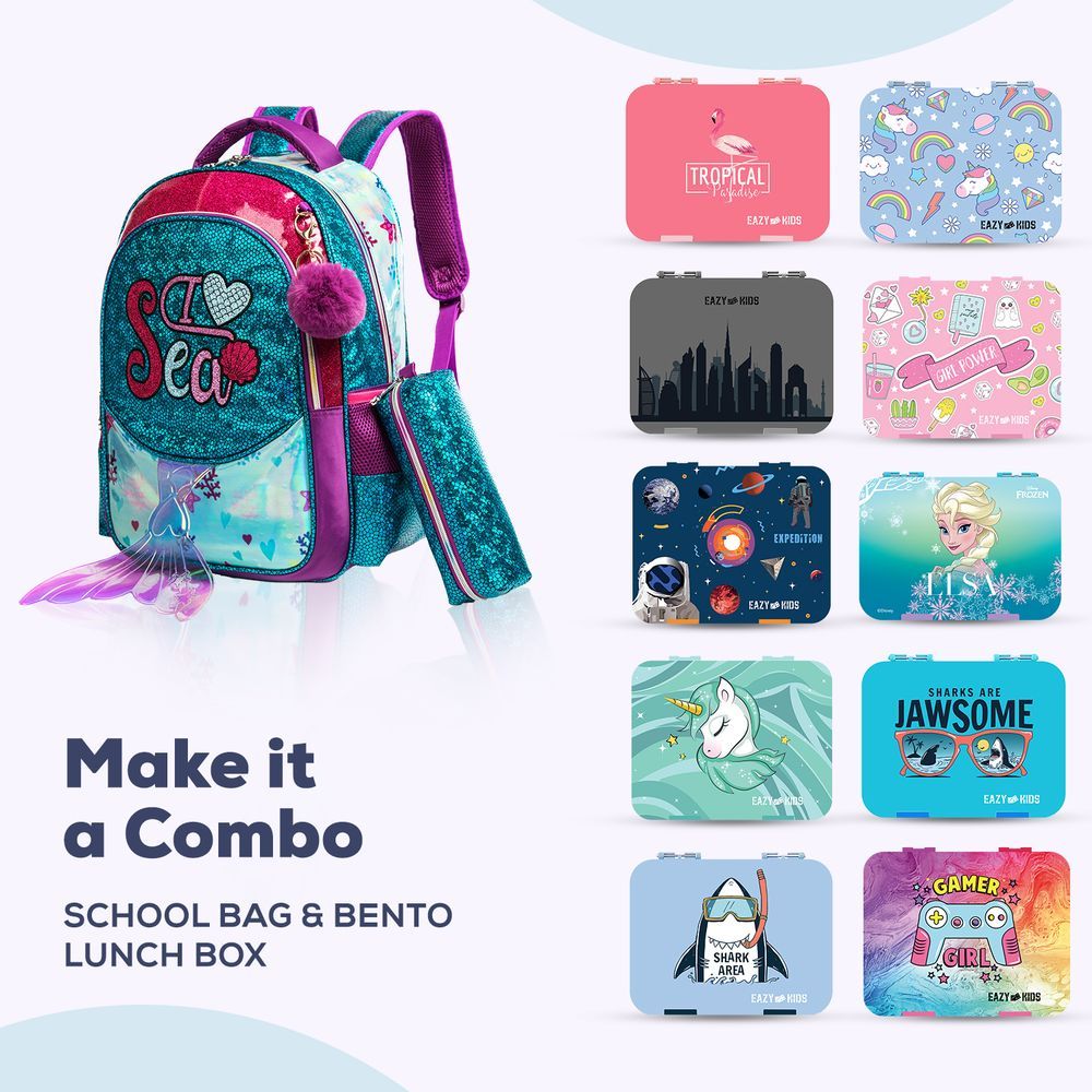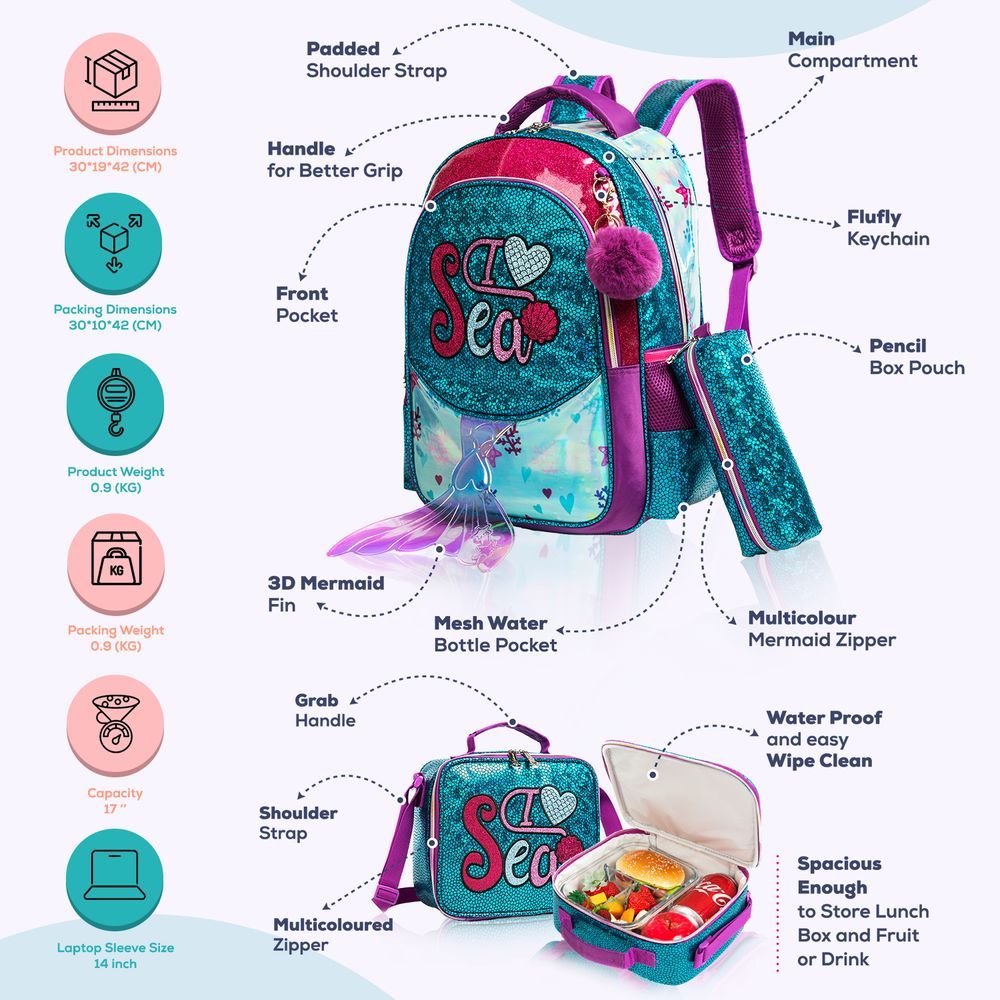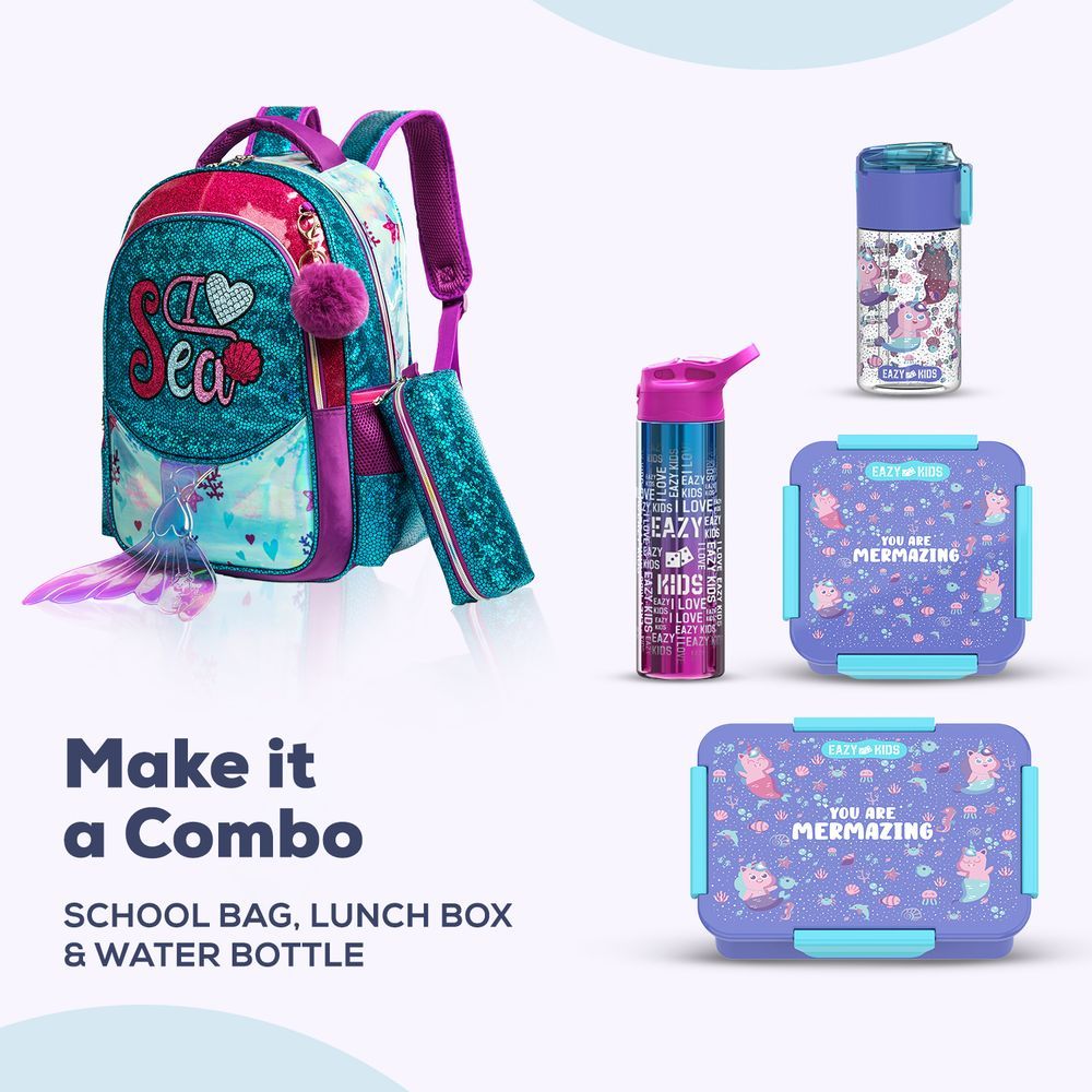 The Sea Green Eazy Kids Backpack Set (17 inch) includes a spacious backpack, lunch bag, and pencil case. With an elegant tone and practical features like padded straps and multiple compartments, it’s ideal for schoolchildren seeking both style and smart storage in one complete set.