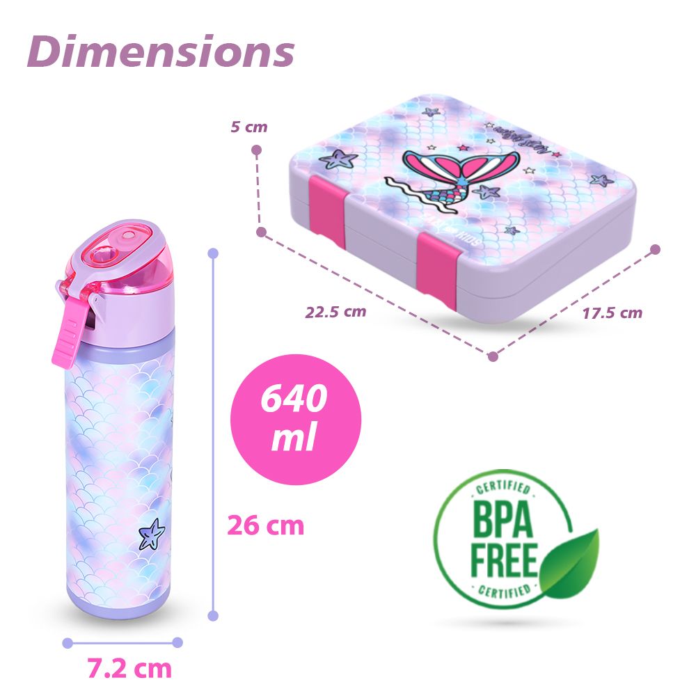 Product Dimensions : Lunch Box: 22.5 x 17.5 x 5 cm Water Bottle: 7.2 x 9.1 x 26 cm