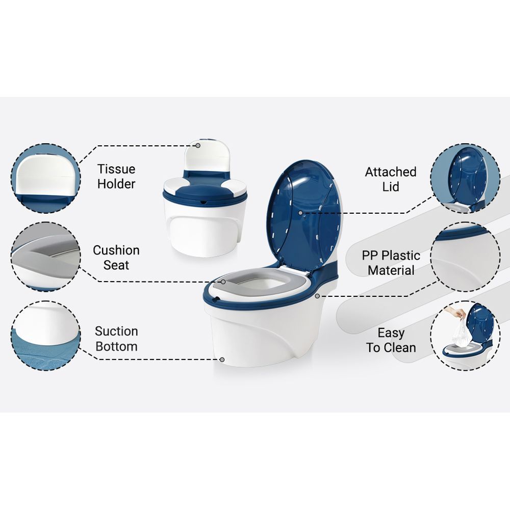 The Eazy Kids Potty Training Seat helps toddlers transition smoothly from potty to adult toilet. Its smaller, realistic design reduces fear and encourages independence. Features include a built-in wipe dispenser, a pee guard to prevent splashes, and a removable, easy-to-clean bowl. The ergonomic, contoured non-slip seat with a soft removable pad ensures comfort and hygiene. A suction base keeps the seat stable on most standard toilets. Lightweight and durable, it makes potty training safe, comfortable, and stress-free.