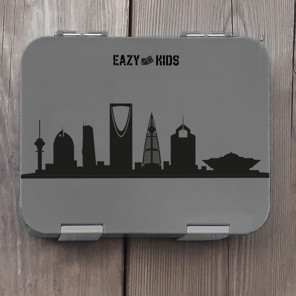 This 4-Compartment Bento Box by Eazy Kids in Skyline Saudi Grey is crafted from Tritan plastic, a BPA- and BPS-free material known for toughness and safety. Featuring a slanted opening for better accessibility, each compartment is sealed with leakproof silicone to hold sauces and yogurt.