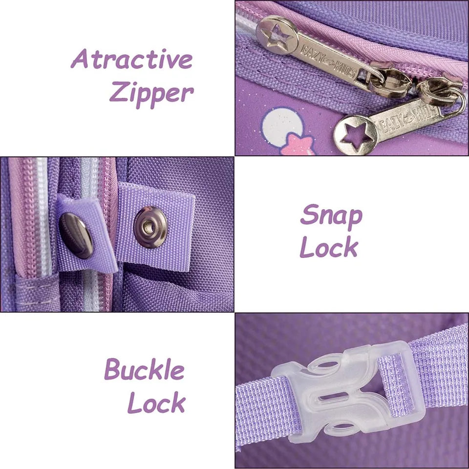 The beautiful design of the two Button front lid pocket for easy access. Zippers are solid and sturdy; they don't easily break off even with constant use. Pullers have a firm grip so sliding the zipper to open or close is easy for your kid. The backpack is made of durable water-resistant material which is very easy to clean and keep books and essentials safe from getting wet in rain. The backpack comes with Lovely colours and beautiful designs, it's a great gift for back to school.