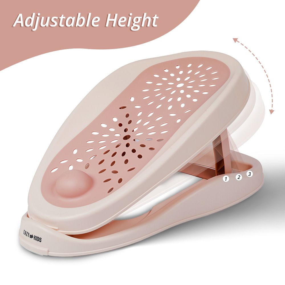 The Eazy Kids Soft Bath Support 3-Stage Bather in Pink offers ergonomic support during bath time. Designed for newborns and infants, it can be used on countertops, sinks, or bathtubs. The breathable mesh fabric is soft, quick-drying, and resistant to mold and mildew. Featuring 3 recline positions for added comfort, its anti-skid base ensures safety and stability. A fold-flat design and built-in hook make storage easy. The sturdy plastic frame is durable and lightweight, supporting safe bathing while soothing your baby with its contoured, spa-like comfort.