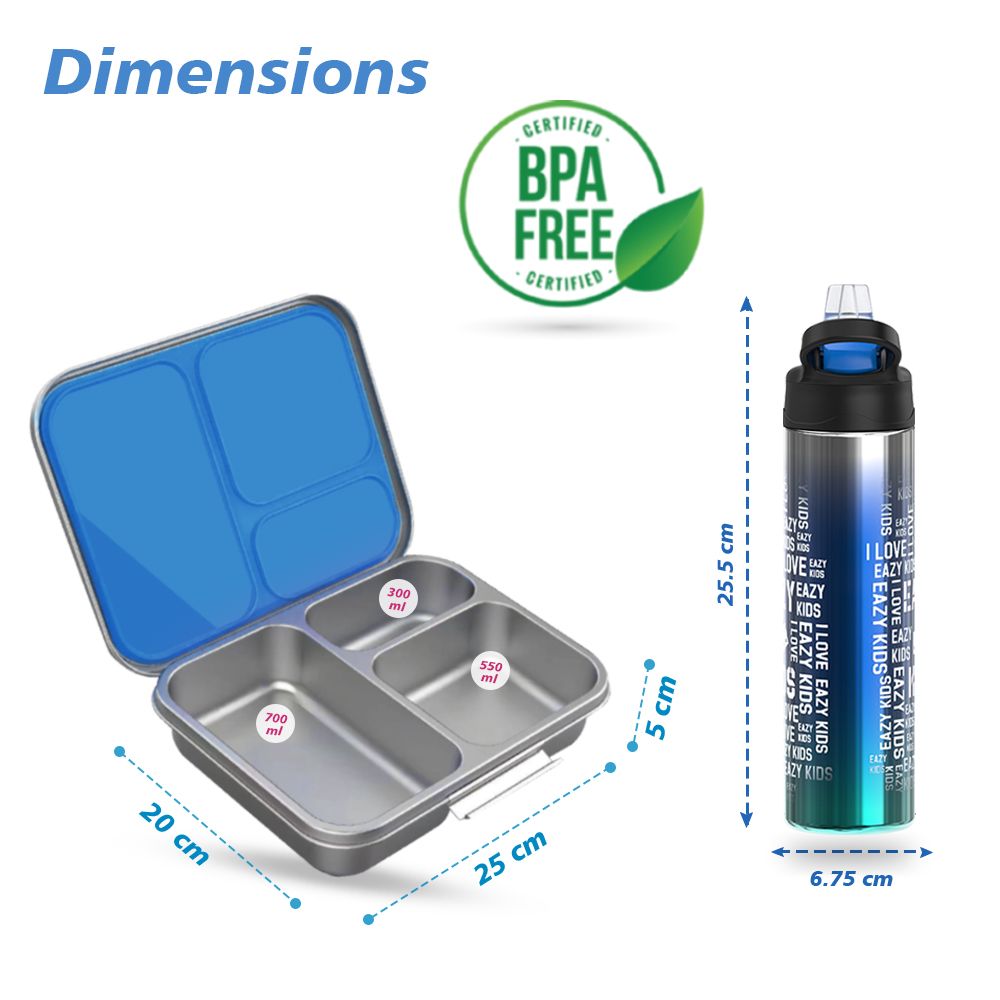 Packing Includes: 1 x Eazy Kids 3 Compartment Bento Steel Lunch Box (1750 ml), 1 x Stainless Steel Water Bottle (530 ml).
