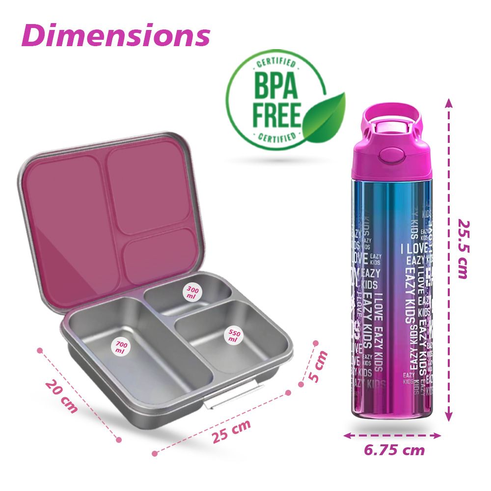 Product Dimensions : Lunch Box: 25 x 20 x 5 cm Water Bottle: 6.75 x 9.5 x 25.5 cm