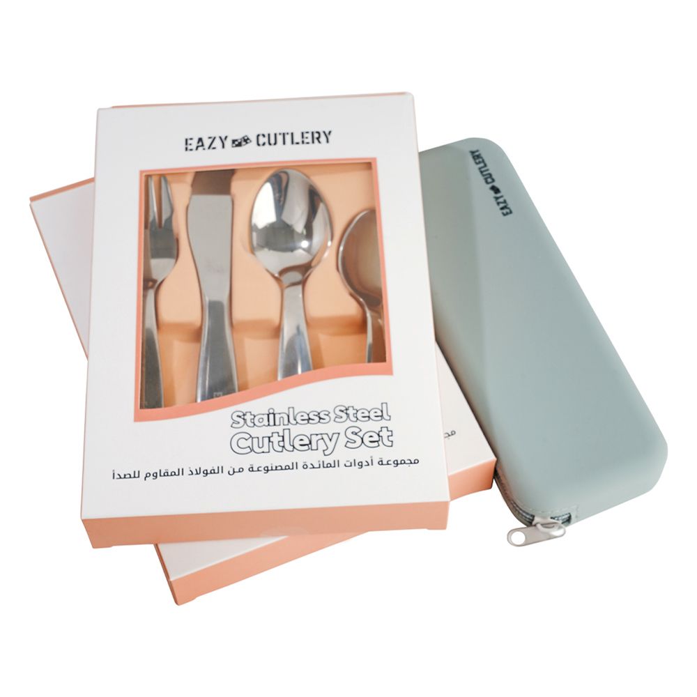 The Eazy Kids 4‑Piece Stainless Steel Cutlery Set in Grey combines style and function. Crafted from durable stainless steel for longevity and ease of use, the set includes a spoon, fork, knife, and teaspoons sized perfectly for children and adults. Compact and hygienic, it comes with a silicone pouch for convenient storage and transport—ideal for school lunches, picnics, or travel. This stylish, eco-friendly set encourages reusable dining habits with ease and elegance.