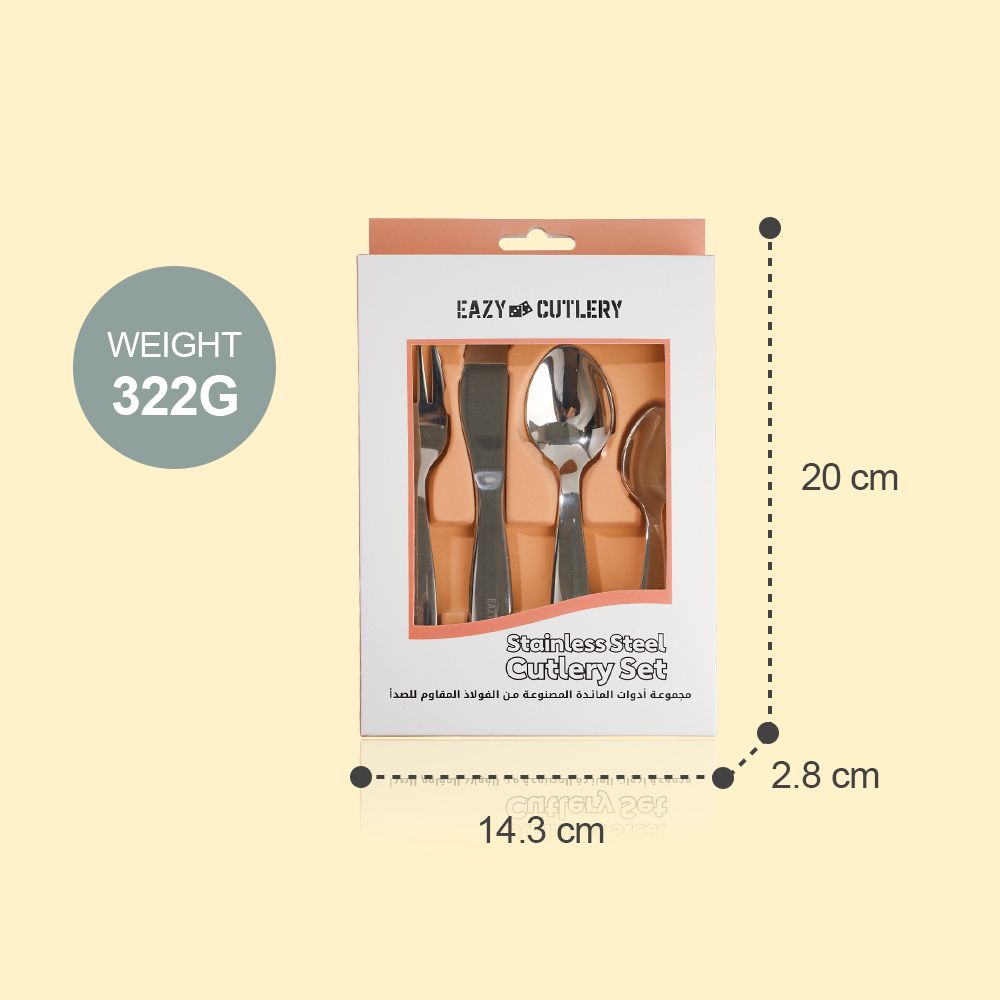 Product Dimensions : Spoon: 15 x 3.7 cm Fork: 15 x 2.6 cm Knife: 17 x 2 cm Tea Spoon: 12.6 x 3 cm Silicone Pouch: 19 x 7 x2.5 cm
