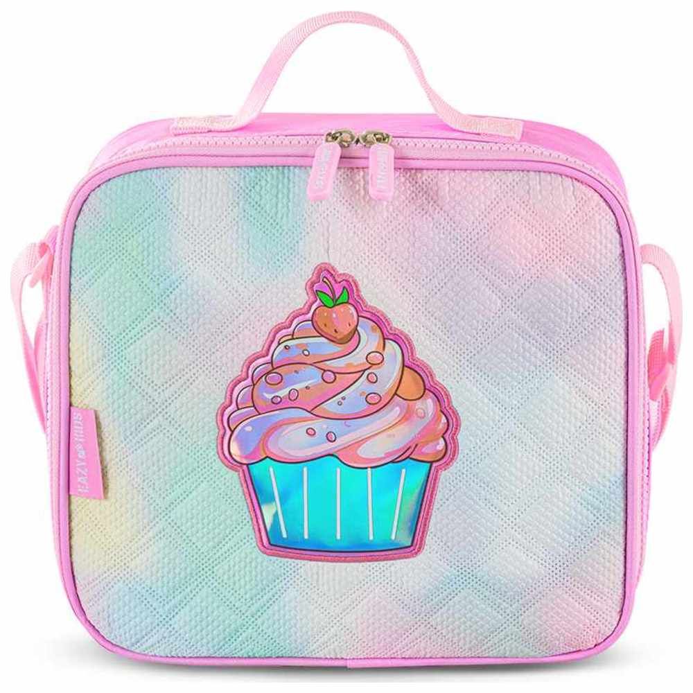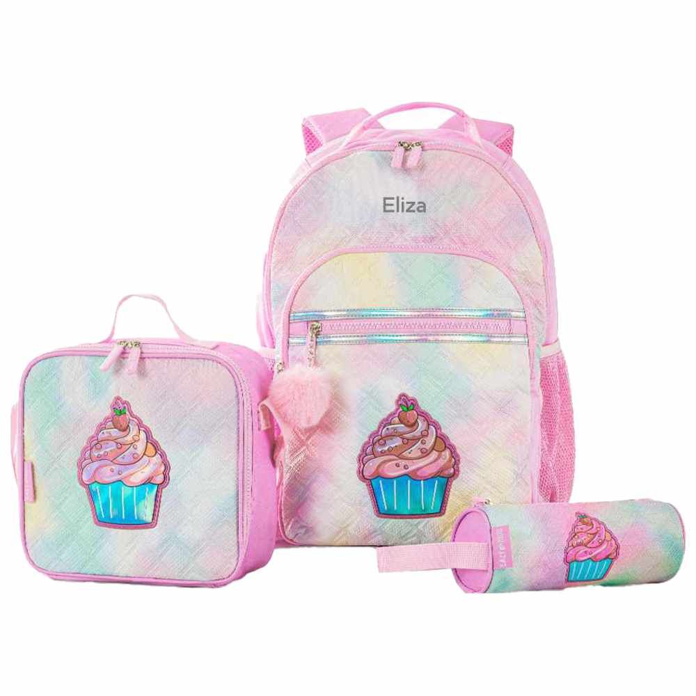 - A coordinated school set with backpack, lunch bag, and pencil case in a playful cupcake print.