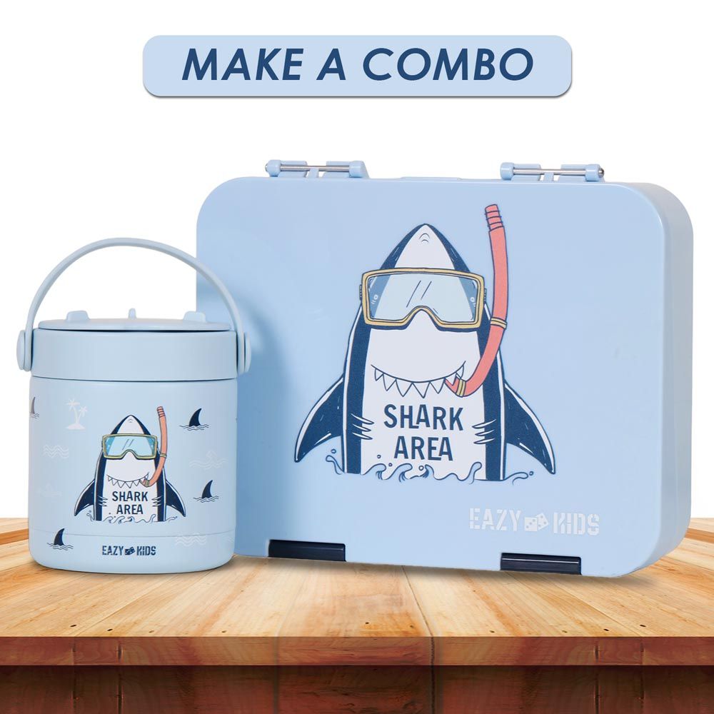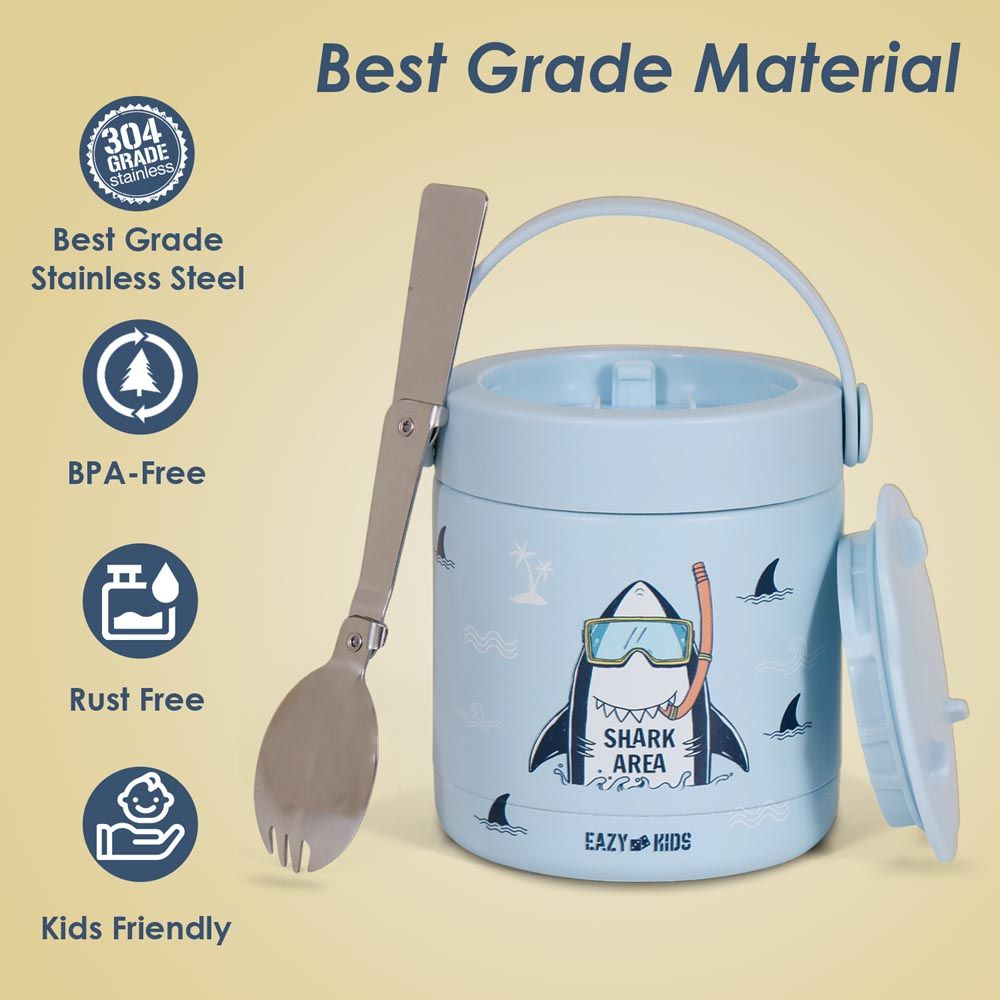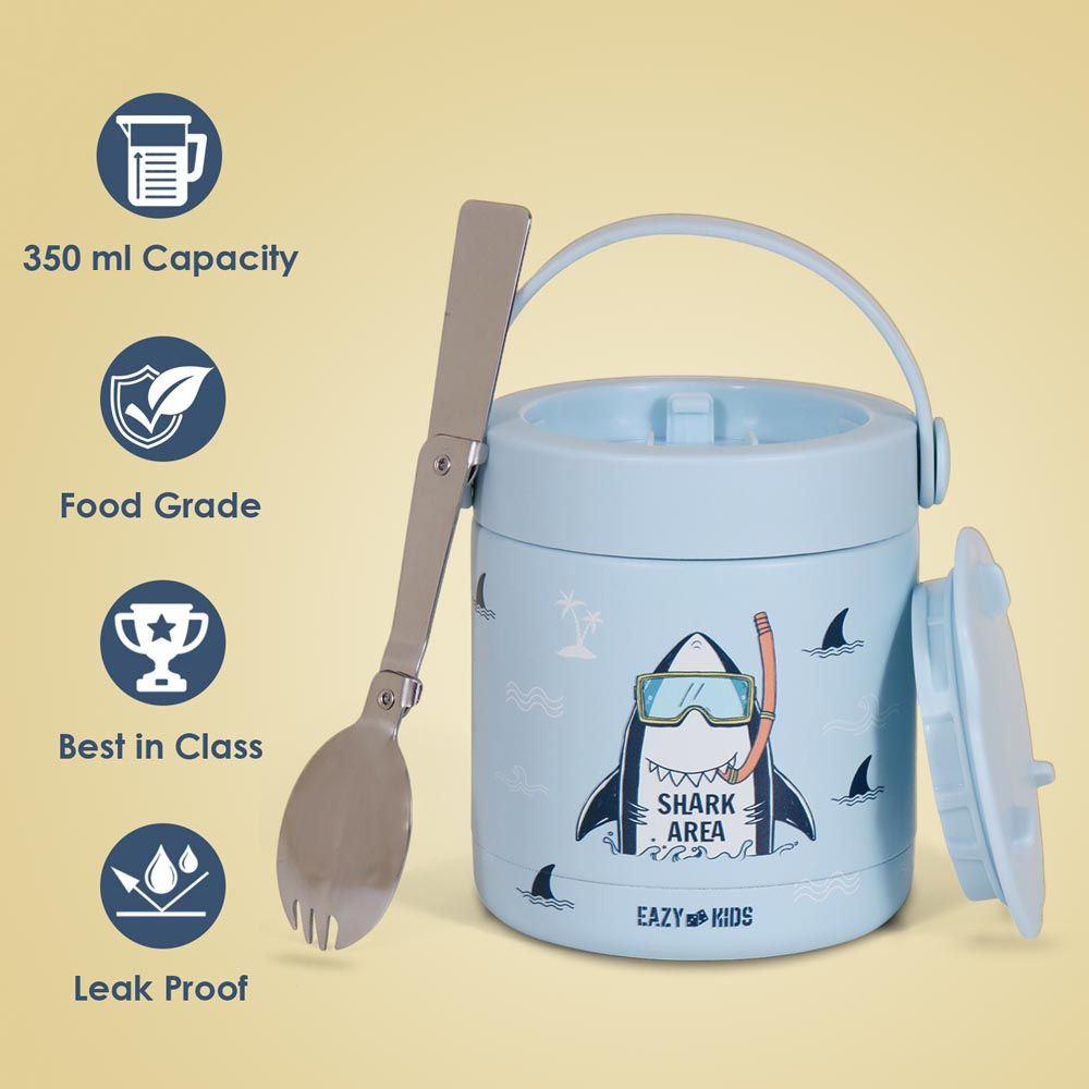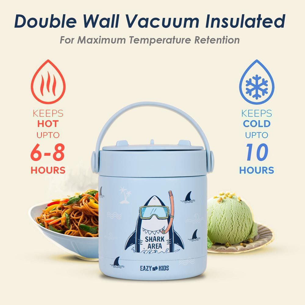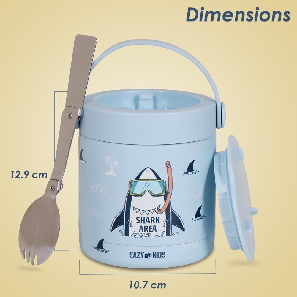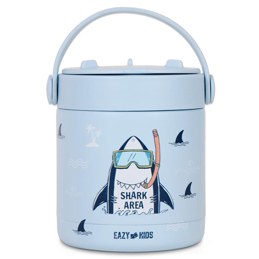 The Eazy Kids Super Shark Insulated Food Jar in Blue (350ml) is designed to keep food hot or cold for extended periods. Featuring a fun shark design, it appeals to children and encourages healthy eating on the go. Made of stainless steel, it is durable, leak-proof, and BPA-free.