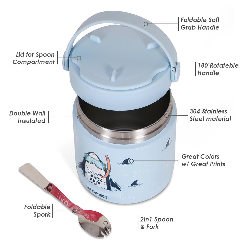 - Fun sharkthemed insulated jar with a stainless steel folding spoon made for kids
