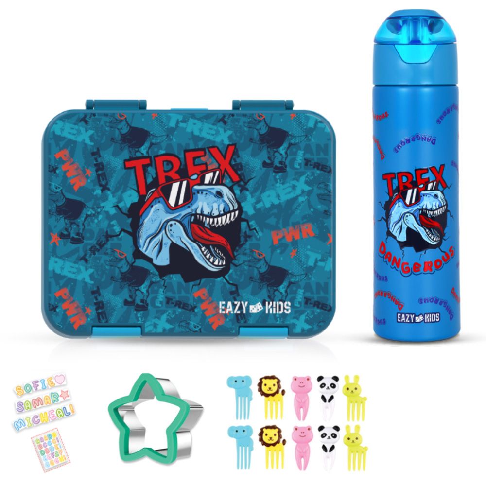 Make school meals fun with the Eazy Kids T-Rex Bento Set featuring a Tritan 6 & 4 convertible lunch box with silicone-sealed leak-proof compartments and a slant-mouth lid for easy access. Includes a 640ml stainless steel bottle, BPA and Phthalate-free, double-wall insulated to maintain temperature, plus spray function and silicon-lined sipper lid. Dishwasher safe. Bonus accessories: sandwich cutter, fruit picks, and alphabet stickers. Designed to keep meals fresh and engaging for kids.