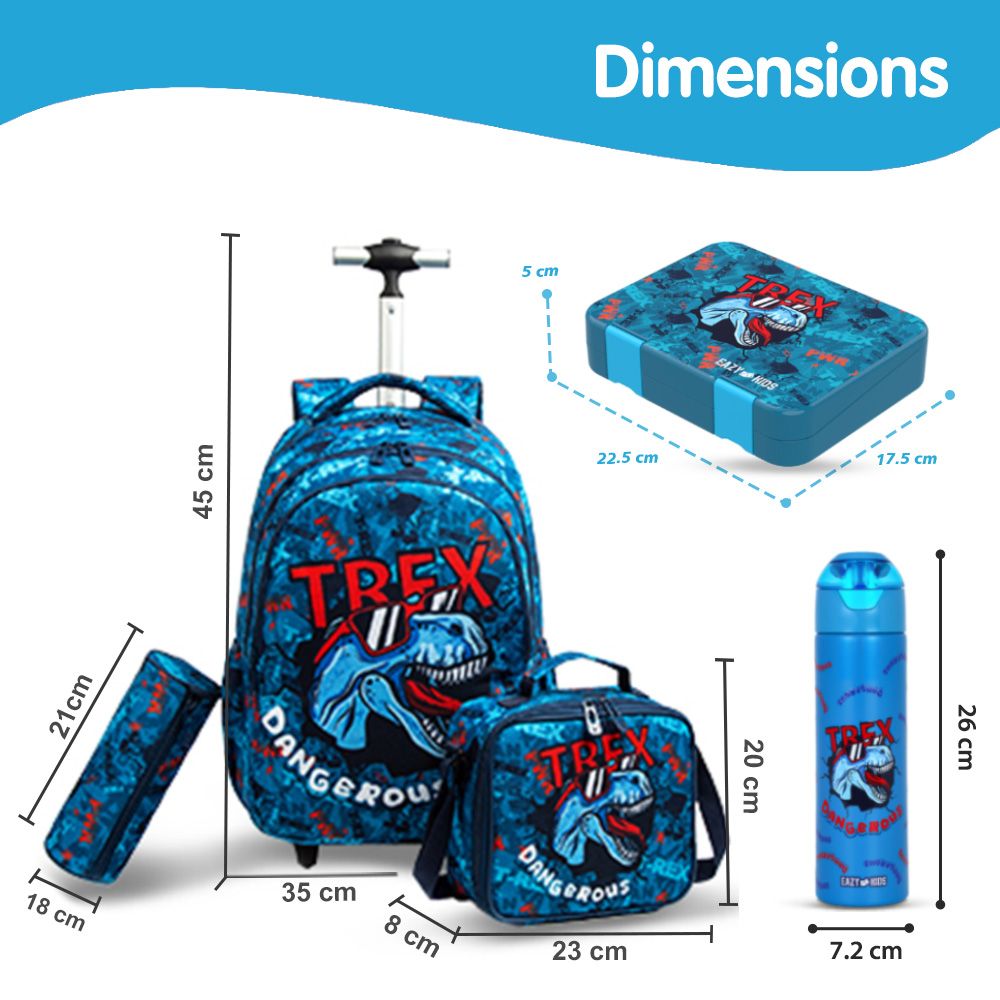 - 5-in-1 T-Rex school set includes trolley bag, lunch kit, pencil case, and water bottle