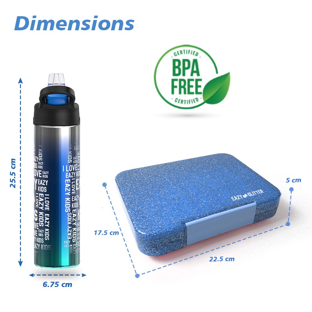 Product Dimensions : Lunch Box: 22.5 x 17.5 x 5 cm Water Bottle: 6.75 x 25.5 cm