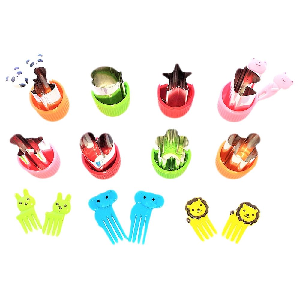 Make lunch fun with this set of cutters and picks! Includes 4 sandwich cutters, 4 cookie cutters, 8 vegetable cutters, 10 animal-shaped fruit picks, and 2 egg molds. Perfect for creating fun-shaped sandwiches, veggies, cookies, and eggs to delight kids at lunchtime. Specifications: Sandwich Cutter - 11 x 11.5 x 4 cm; Cookie Cutter - 9 x 4.5 x 4 cm; Veggie Cutter - 3 x 4 cm; Egg Mold - 10.5 x 9 x 1.5 cm; Fruit Picks - 2.5 x 4.5 cm. Adds creativity and excitement to healthy meals.