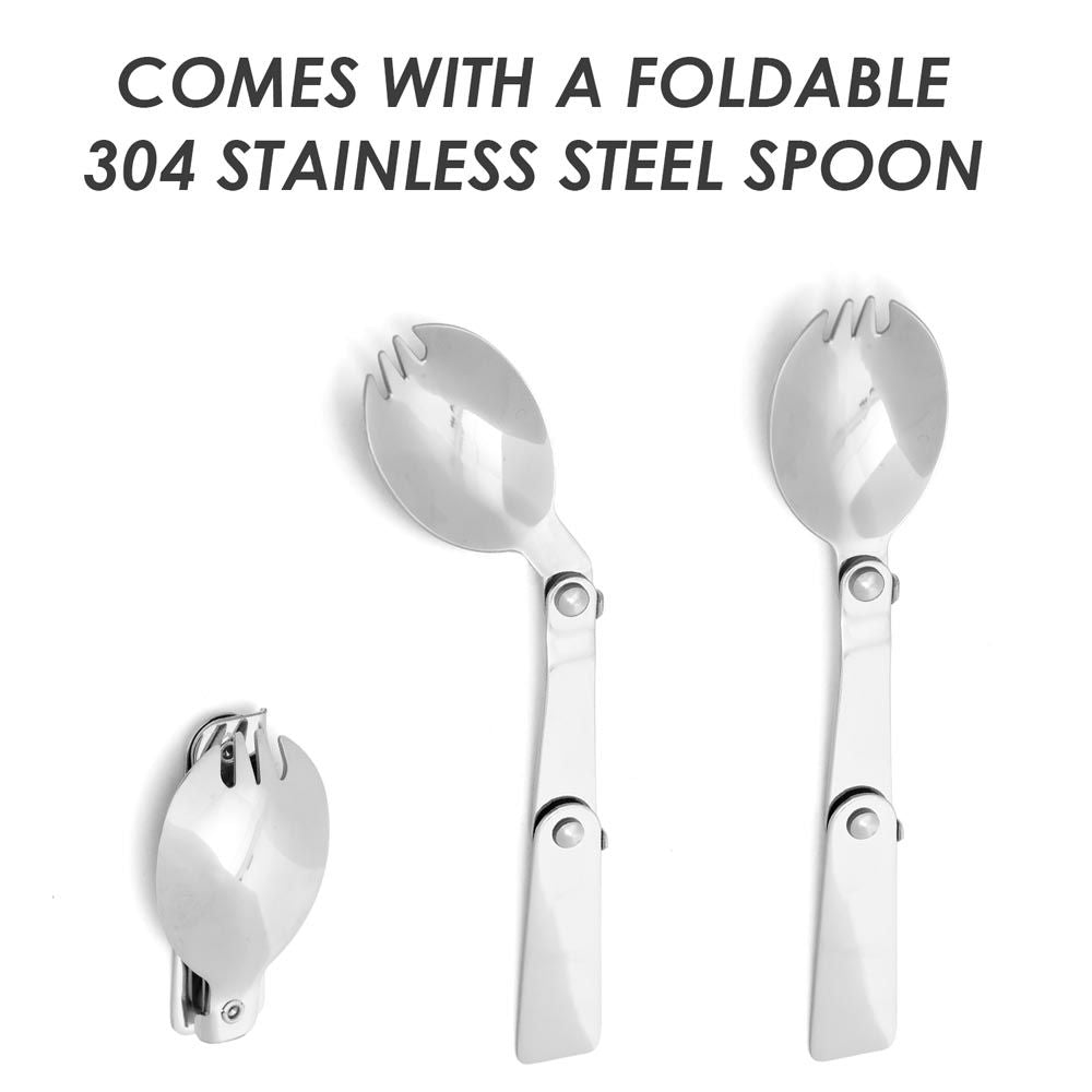 - Stainless steel insulated food jar with a stainless steel folding spoon for keeping meals warm or cold
