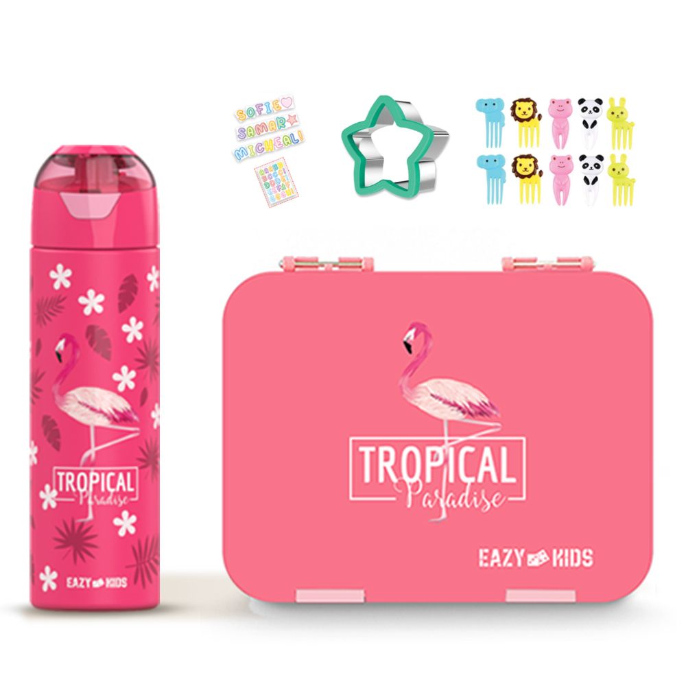 The Tropical Pink Eazy Kids Bento Set includes a Tritan-built, convertible lunch box with 4 or 6 leak-proof compartments and a slant-mouth lid for effortless access. Dishwasher-safe and durable, it pairs with a 640ml BPA-free stainless steel bottle—double-wall insulated to keep drinks hot/cold and includes a spray function for cooling. Accessory kit includes sandwich cutter, fruit picks, and alphabet stickers. Vibrant and practical, this lunch set adds fun and freshness to every school day.