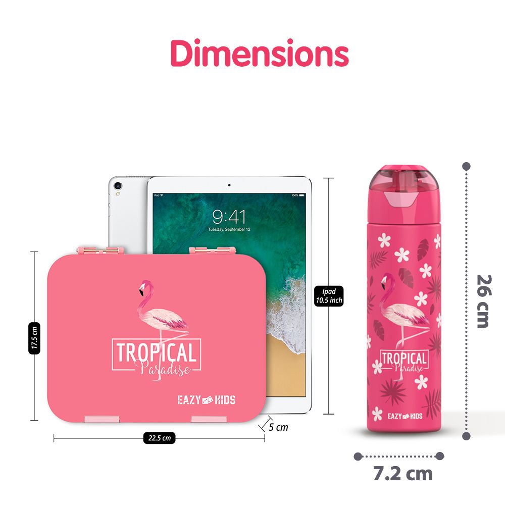 Product Dimensions : Water Bottle: 7.2 x 9.1 x 26 cm Lunch Box: 17.5 x 22.5 x 5 cm