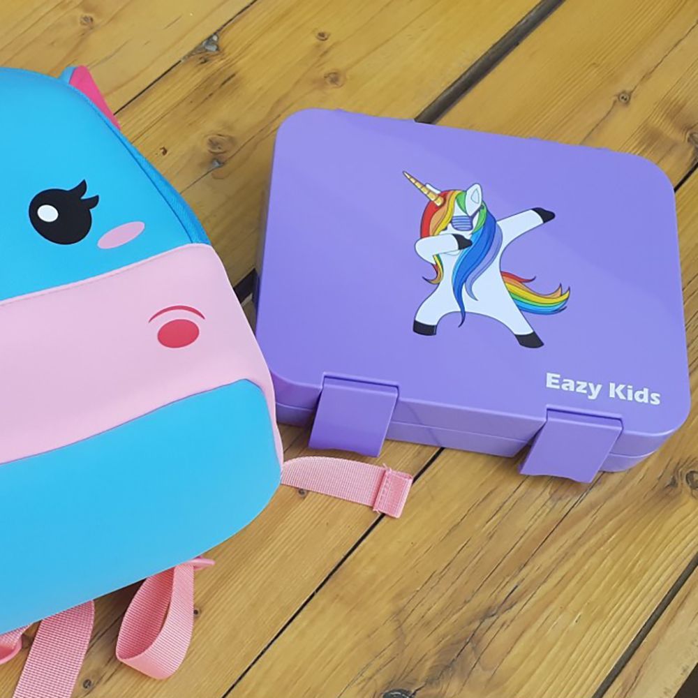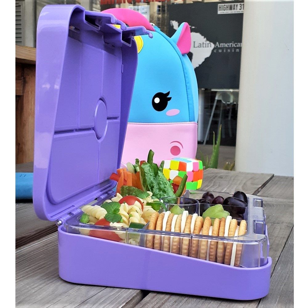Upgrade school meals with the Eazy Kids 6-Compartment Bento Lunch Box in Unicorn Purple. Made of BPA-free Tritan material, it's food-safe, impact-resistant, and odor-free. Features include a unique slant mouth opening, removable leakproof silicone seal tray, and 6 compartments—ideal for varied meals, sauces, and yogurts.