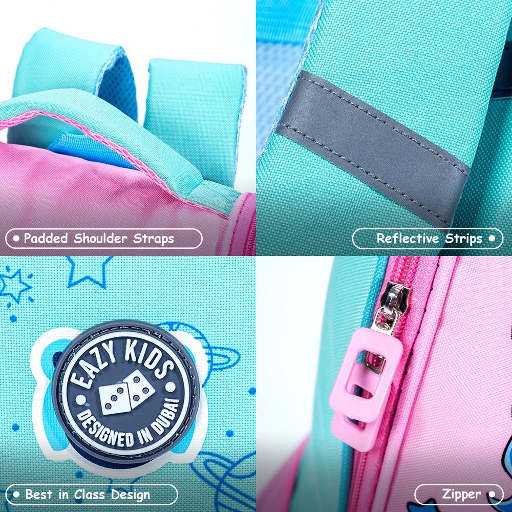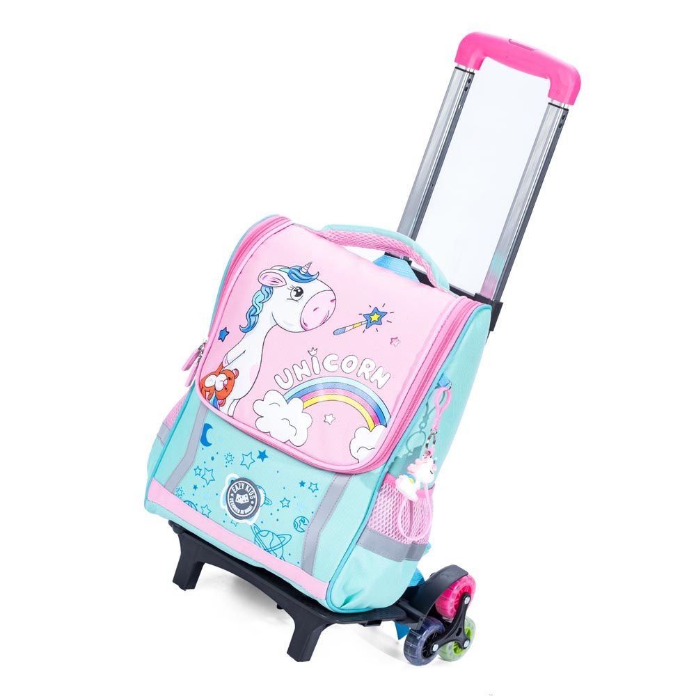 Brighten your child's school routine with the Eazy Kids Unicorn School Bag with Trolley in Princess Pink. Engineered for convenience, this trolley system uses advanced 360-degree 3-wheel technology, ensuring smooth navigation over stairs and surfaces, easing the load up to 50kg. Crafted from lightweight aluminum alloy with a skid-prevention lock, the backpack itself is durable, dirt-proof, and water-resistant. Multiple compartments keep school essentials organized, including twin front pockets and a roomy main zipper section. With sturdy zippers and a safety reflective strip, this bag combines style and safety for every school adventure.