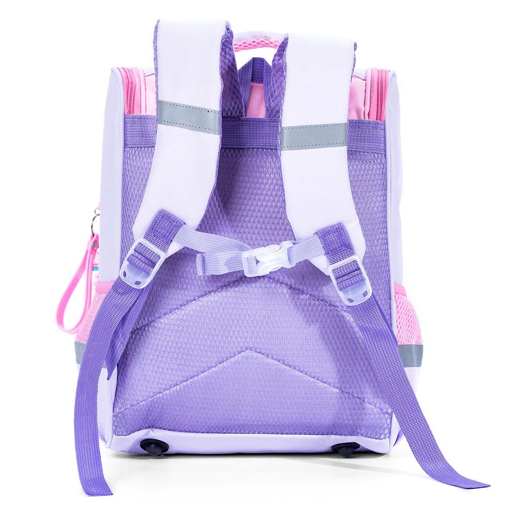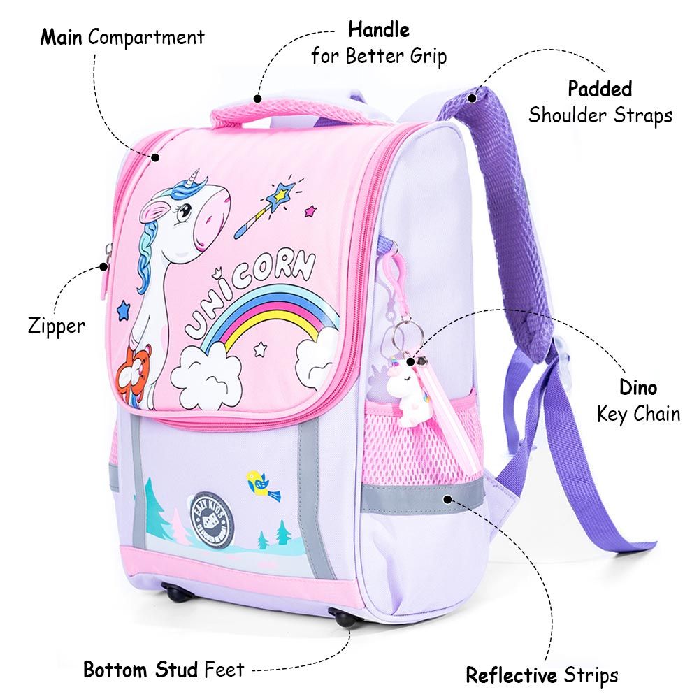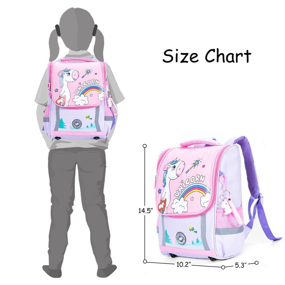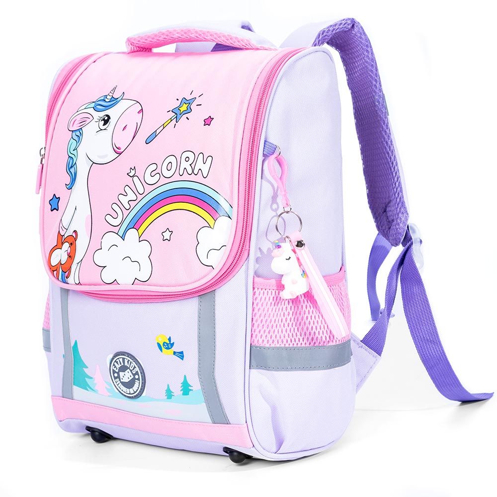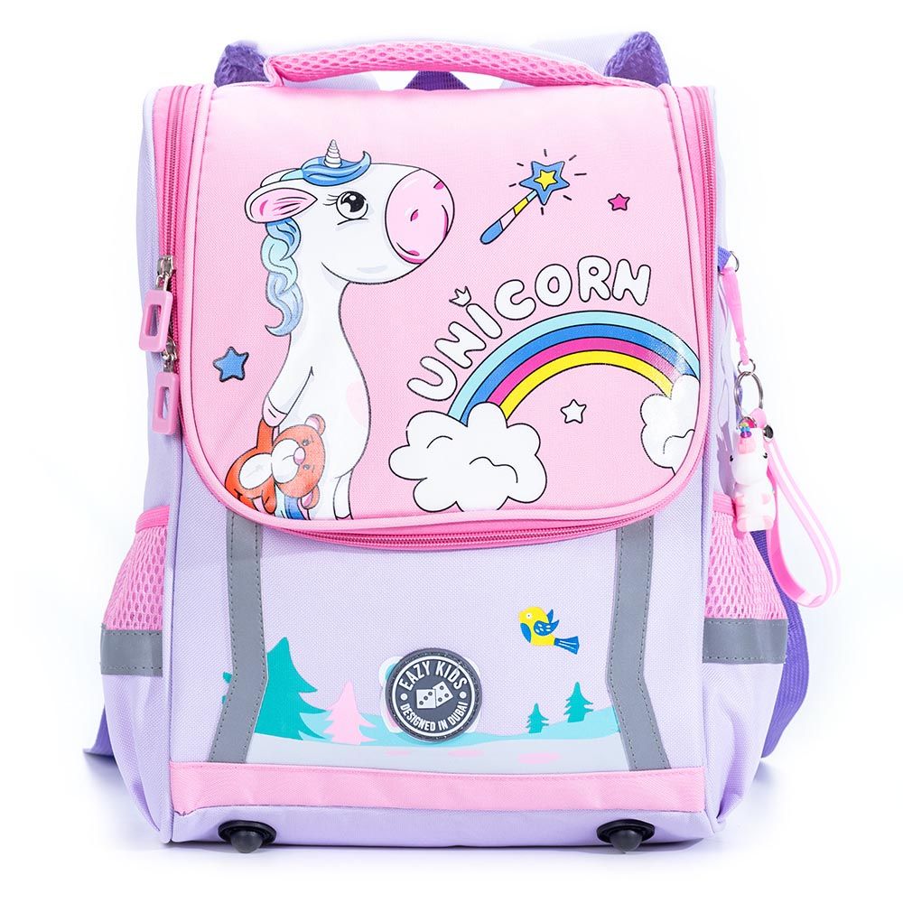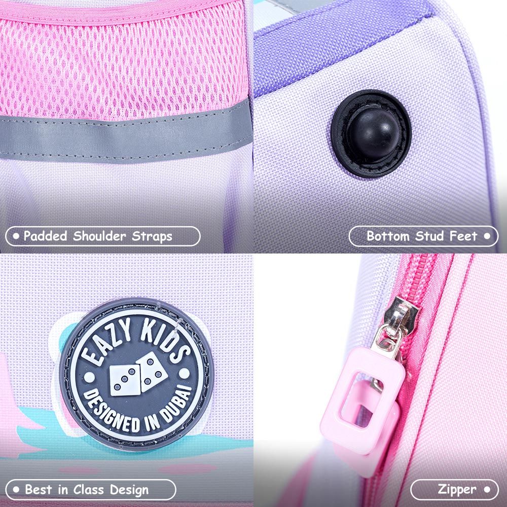 Brighten your child's school routine with the Eazy Kids Unicorn School Bag with Trolley in Princess Pink. Engineered for convenience, this trolley system uses advanced 360-degree 3-wheel technology, ensuring smooth navigation over stairs and surfaces, easing the load up to 50kg. Crafted from lightweight aluminum alloy with a skid-prevention lock, the backpack itself is durable, dirt-proof, and water-resistant. Multiple compartments keep school essentials organized, including twin front pockets and a roomy main zipper section. With sturdy zippers and a safety reflective strip, this bag combines style and safety for every school adventure.
