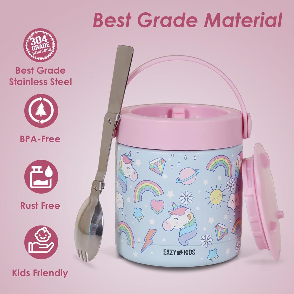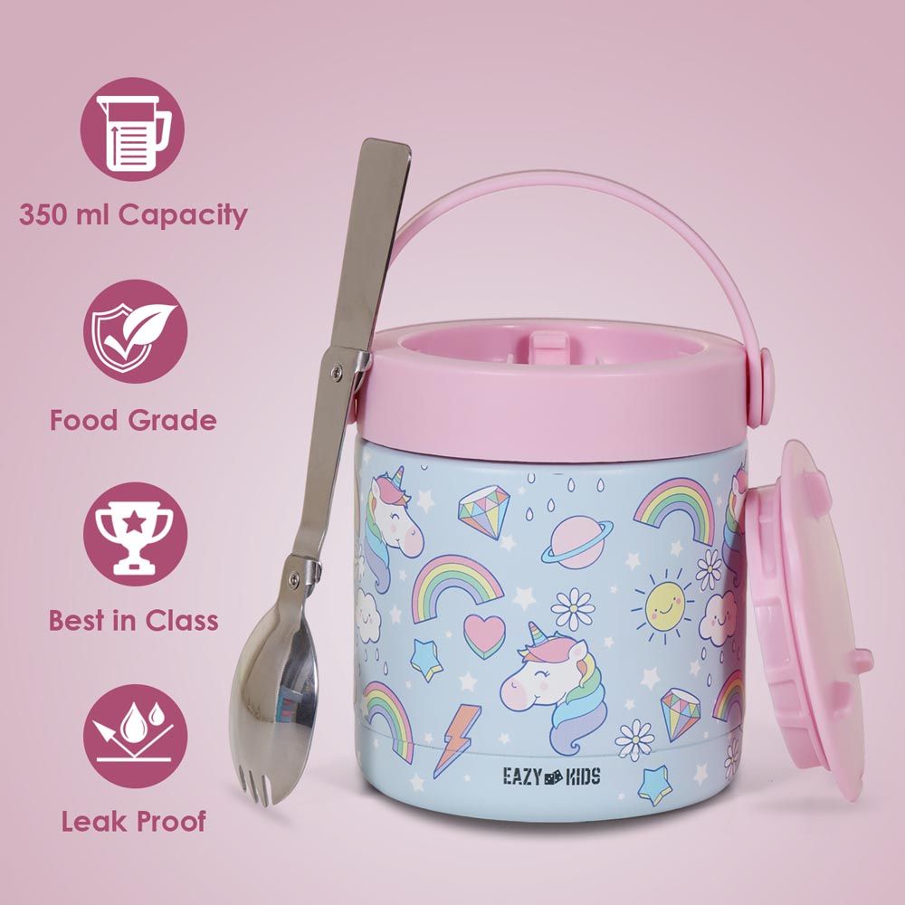 Bring your love of Unicorn with you everywhere with you with exclusive, gorgeous design, We make Meal time fun! Brighten up your kids day with a sumptuous meal in Eazy Kids Meal Box . Eazy Kids Food Jar is made with BPA and Phthalates Free material non-toxic, food grade & eco-friendly double wall insulated 304 Stainless Steel. The Capacity of Food Jar is 350ml for a Balanced Nutritious Meals, comes with Folding Spoon fitted inside the Matching Handle Lid & Top Layer is lined with silicon is completely leakproof. , , The Food Jar is Freezer safe(-18 degree C), Dishwasher safe(Without Lid at Top Rack). Eazy Kids Food Jar is lightweight to carry to school. Food Jar has been designed to keep food warm for 6-8 hours and Cold for ~10 hours. Comes great color with great Prints. Team them up with Eazy Kids Matching Water Bottle and have a great Back to School.