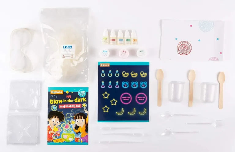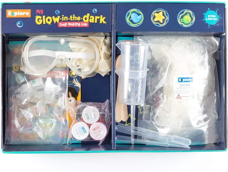 BRIEF DESCRIPTION Are you ready for some glow in the dark fun With my Glow in the Dark Soap Making Lab brought to you by Explore, learn to make fun glow in the dark soaps in shapes using different glow powders fragrance. Comes with an illustrated instruction manual.