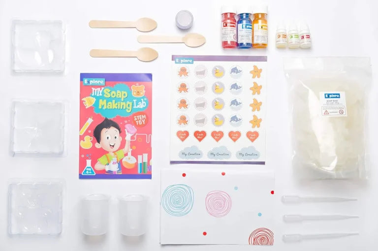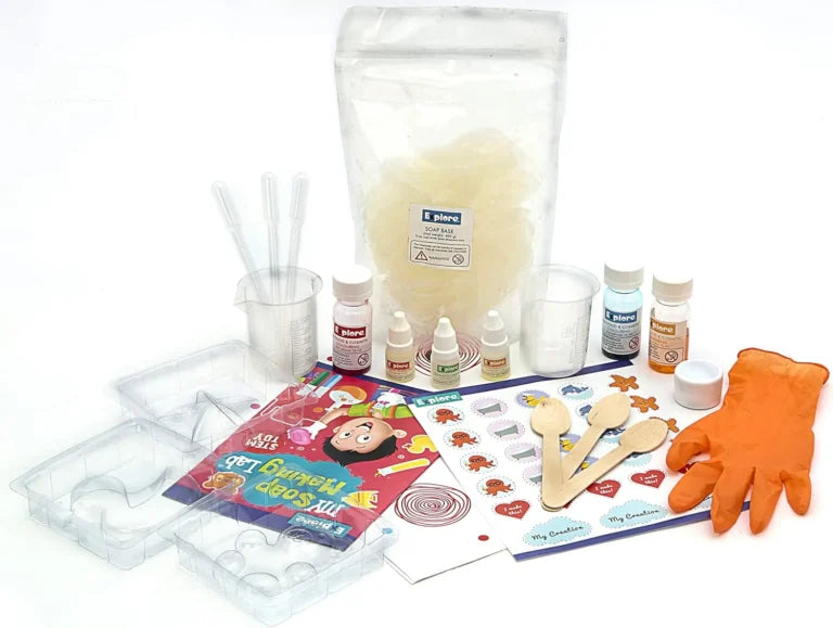 Included in the package: 1 pair of safety gloves, 1 pair of safety goggles, 1 soap base, 3 moulds, 5 fragrances, 1 glow powders, 1 big measuring beakers, 1 droppers, 1 plastic spatulas, 1 wooden spatulas, 1 clear plastic film, 1 gift wrapping paper, 1 decorative sheet, 1 illustrated instruction manual