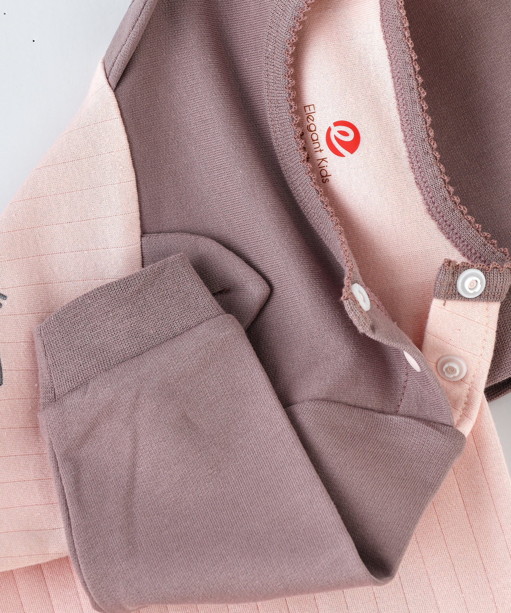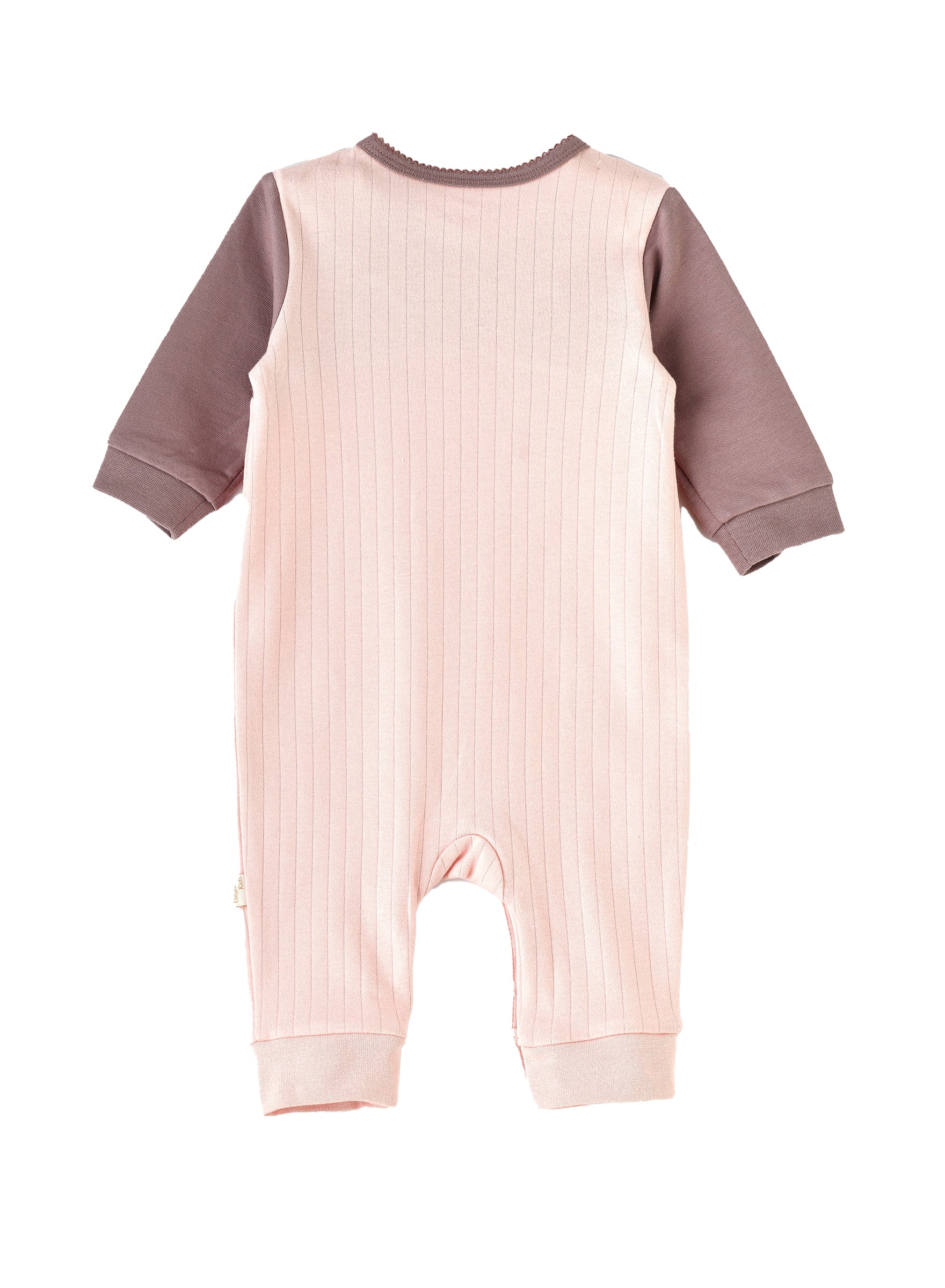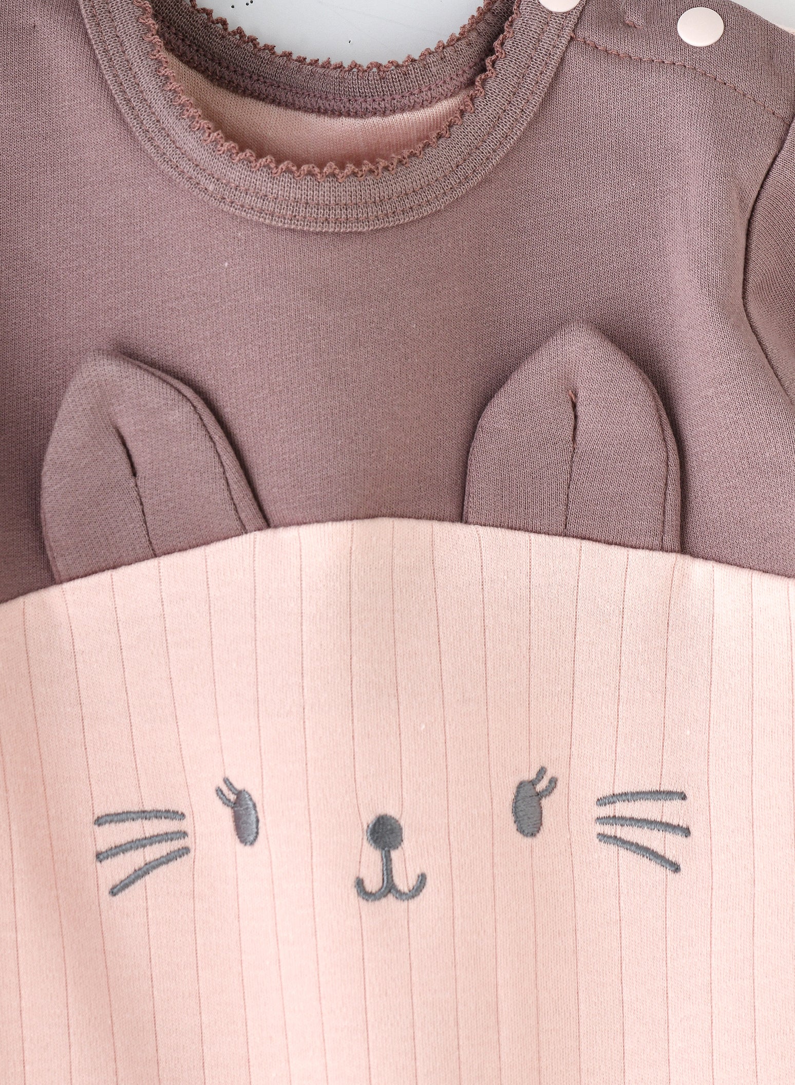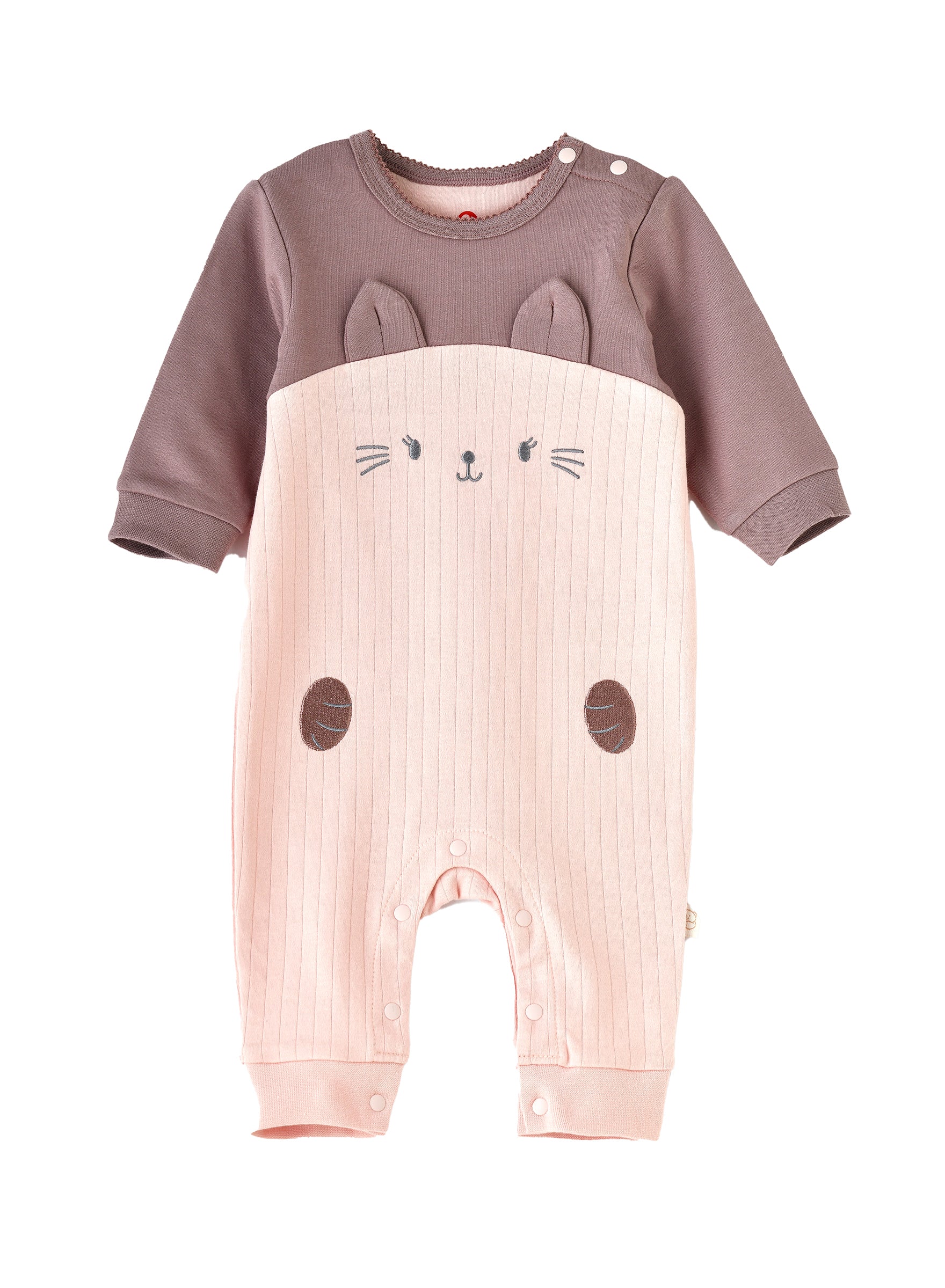 Baby romper with cat detailing, combining pink and brown for a cute and comfy design. Made from a soft cotton .