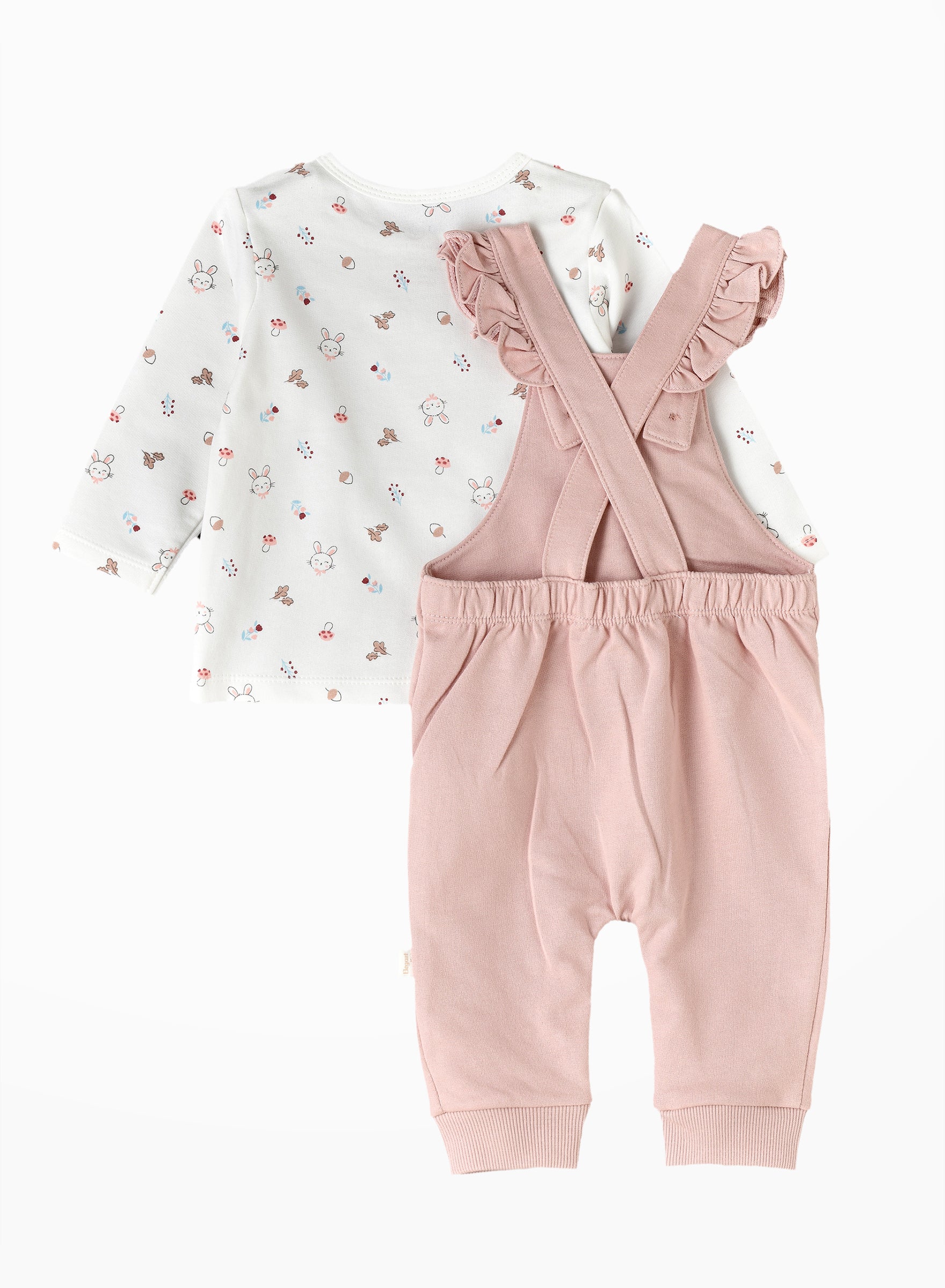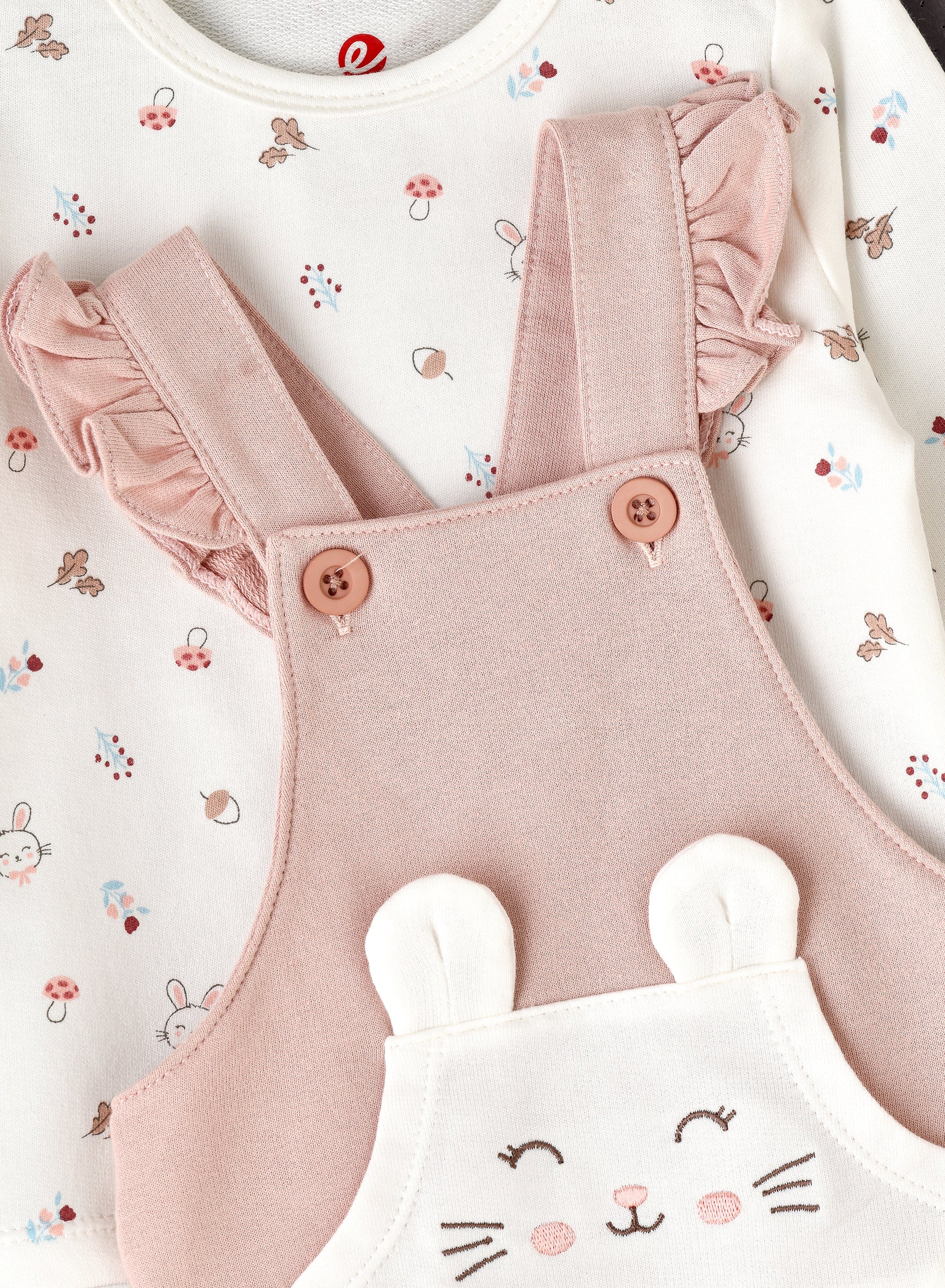 This adorable baby girl outfit includes pink overalls with ruffle detailing and a printed long-sleeve shirt. Crafted from soft cotton, the overalls feature a cute embroidered pocket and snap button closure for easy dressing. The playful bunny and bear print on the shirt adds a charming touch, making this set perfect for casual wear or outdoor play.