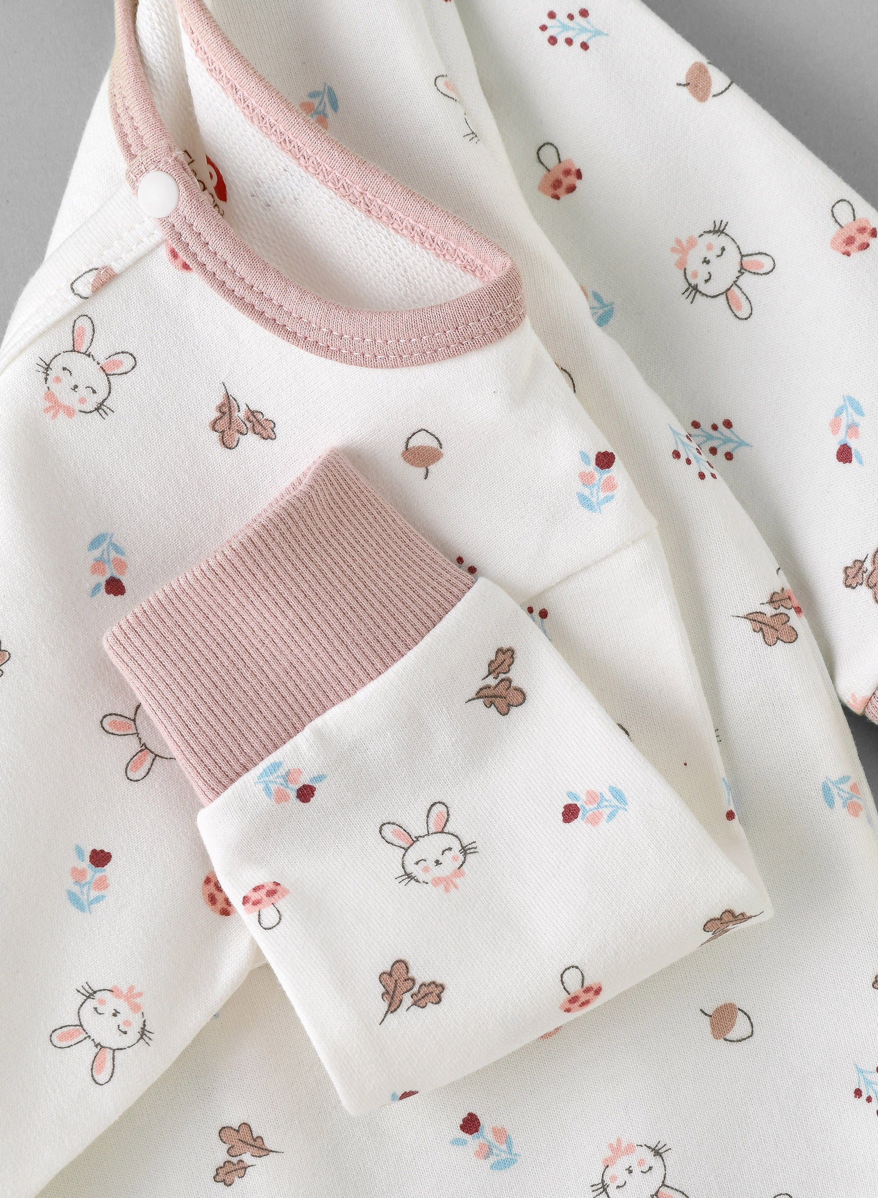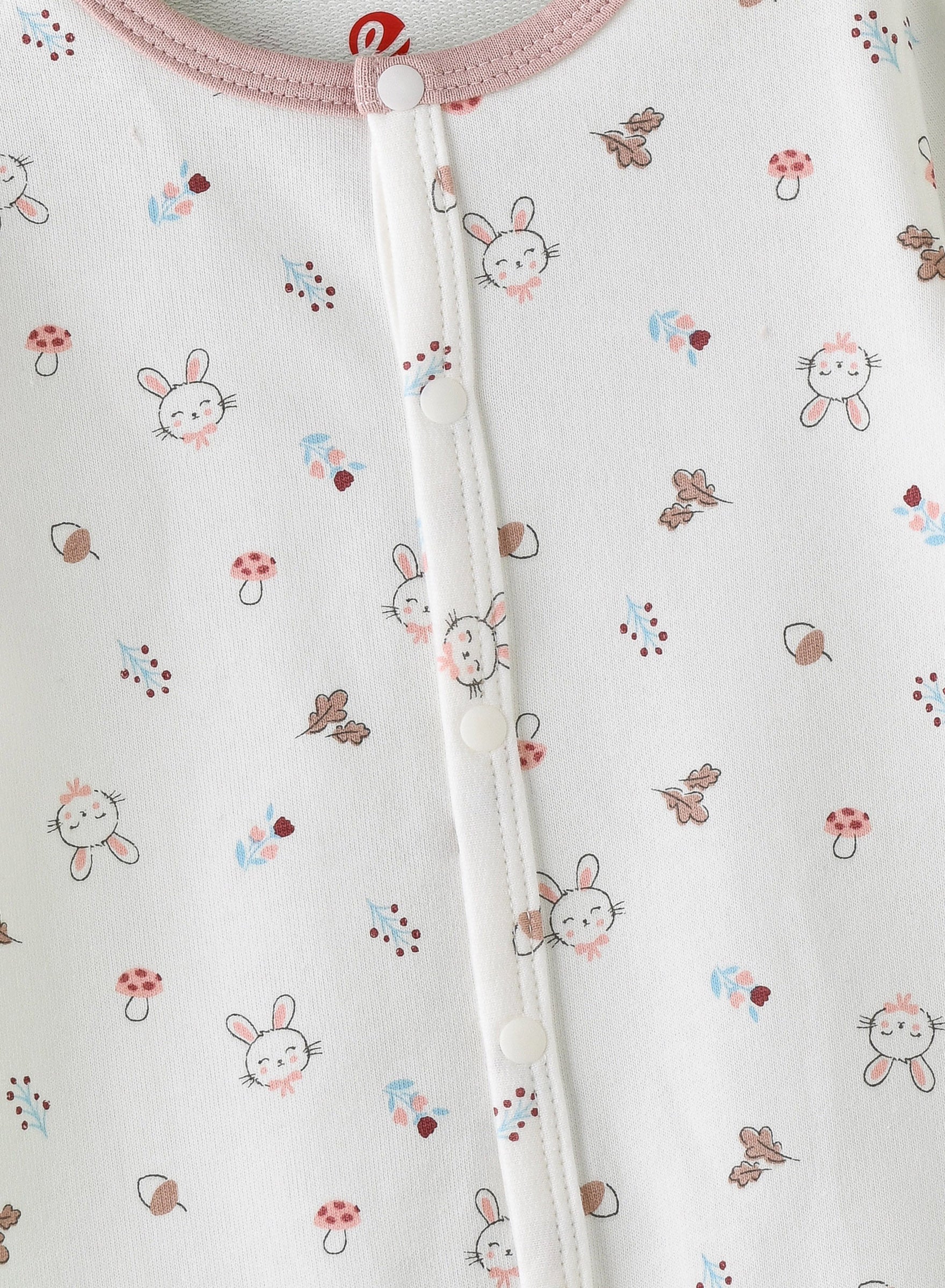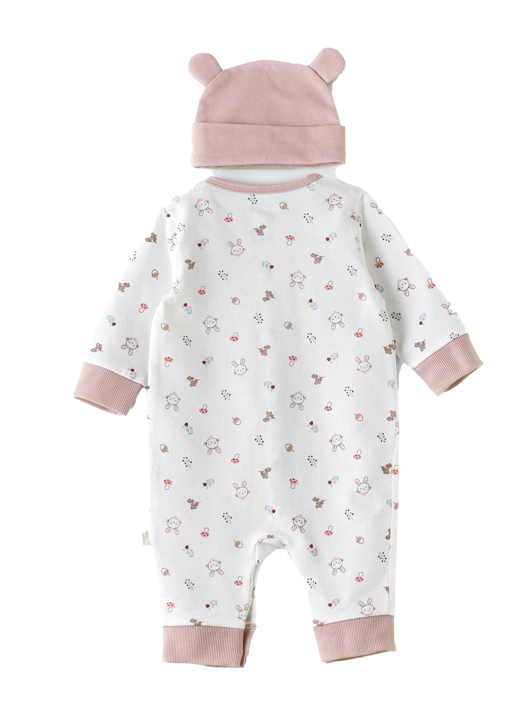 Elegant Kids adorable onesie with bunny print, complete with a matching hat. A perfect choice for your baby's everyday essentials. This fashionable set offers a stylish combination, ensuring your baby girl looks picture-perfect and effortlessly ready-to-go chic look.