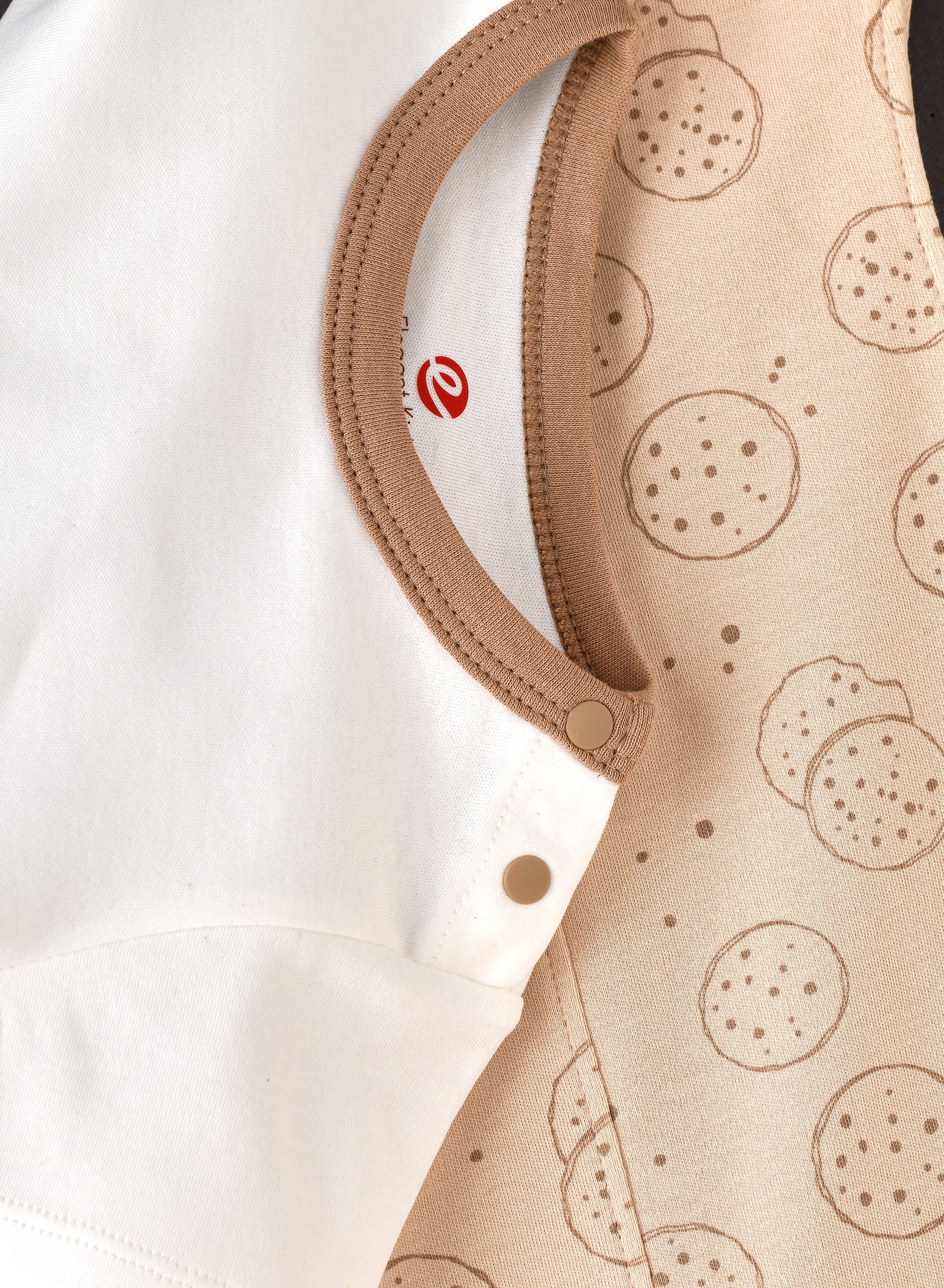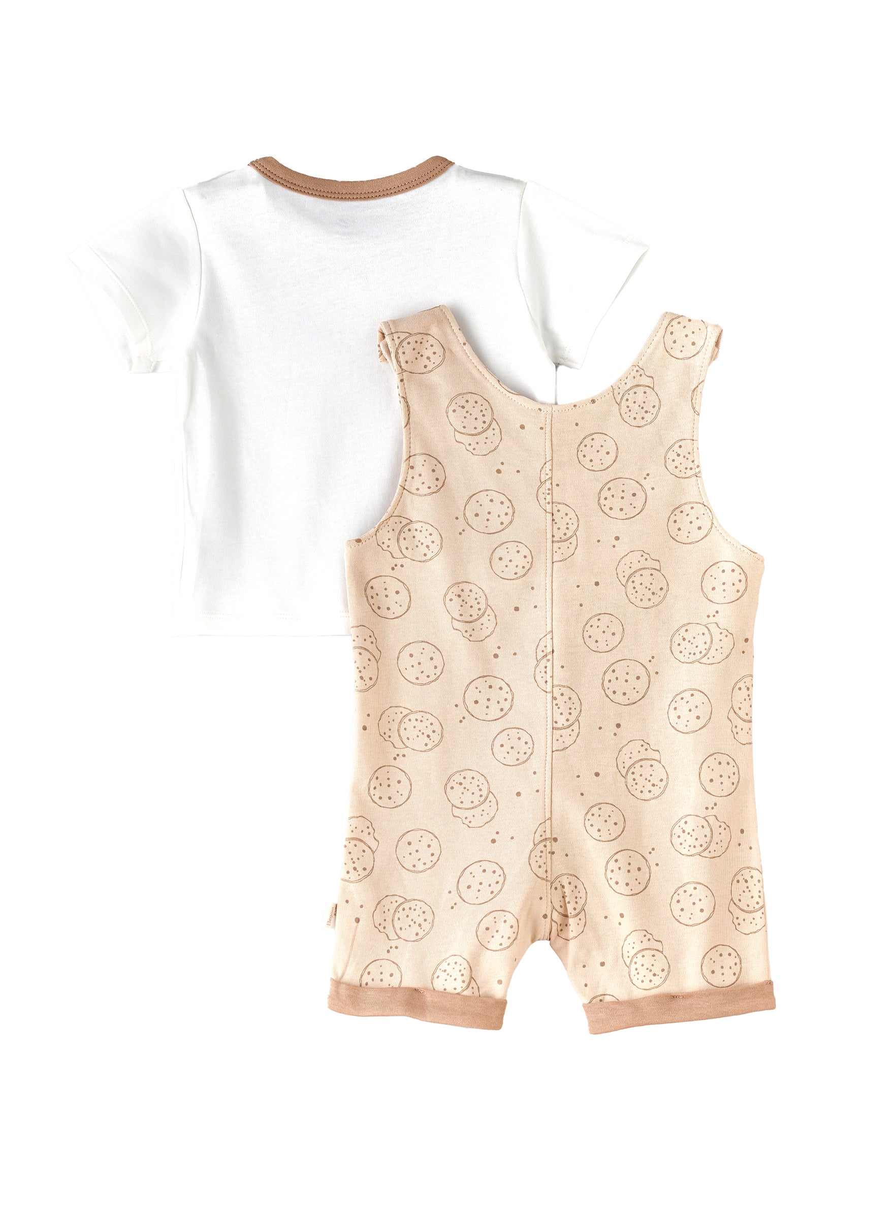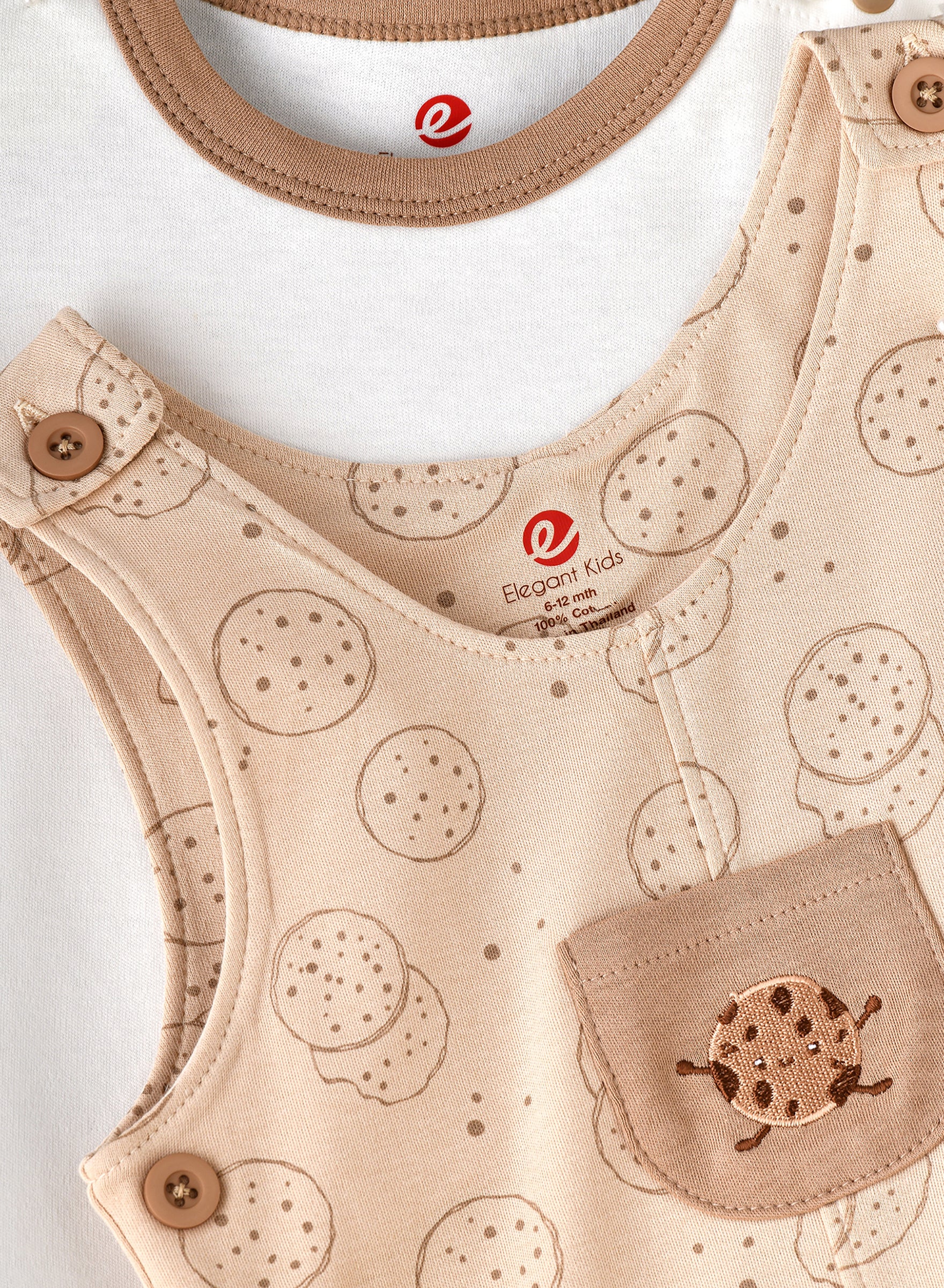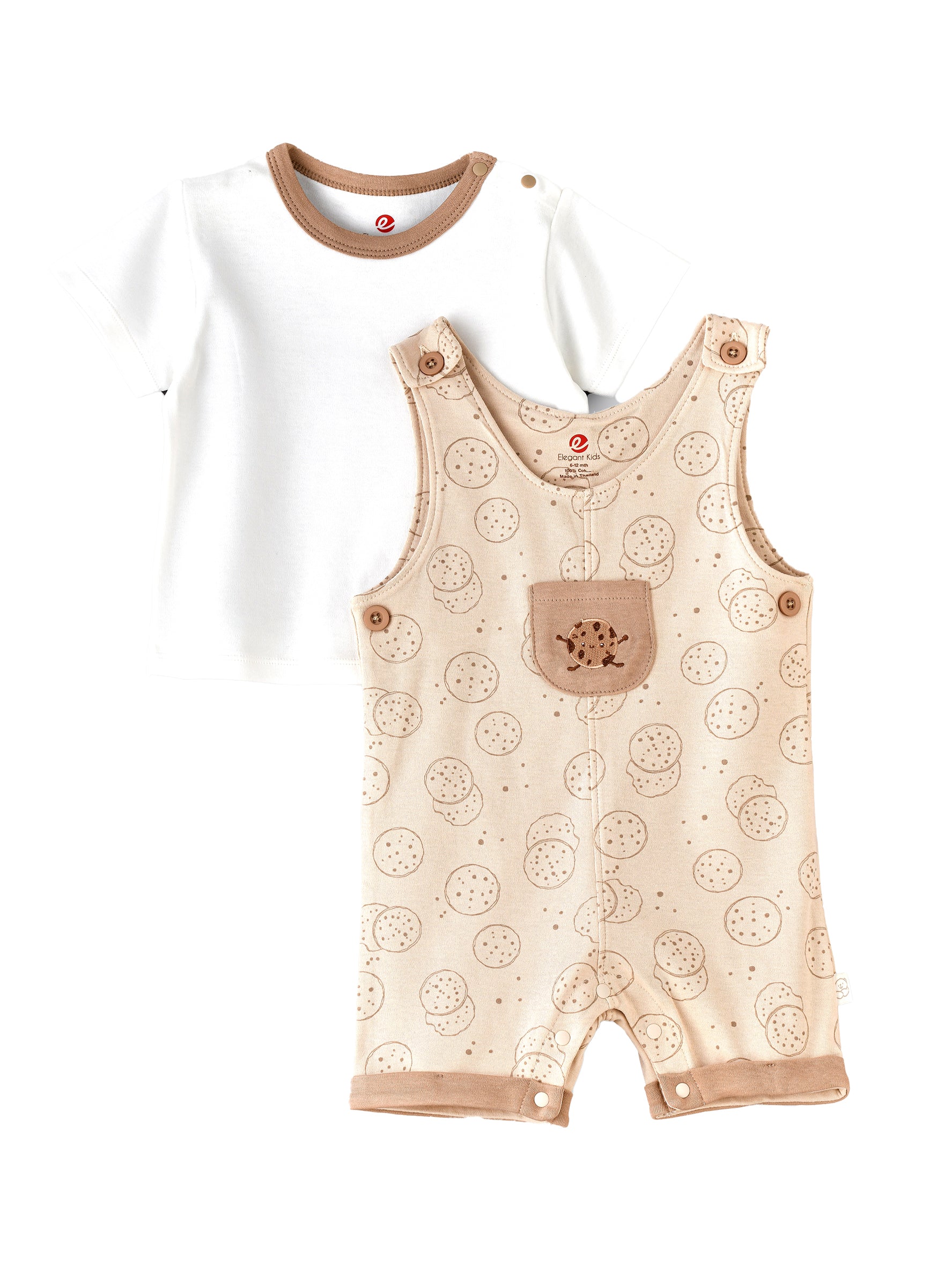 Elegant Kids baby romper set with a cookie print and white tee. A perfect choice for your baby's everyday essentials. This fashionable set offers a stylish combination, ensuring your baby looks picture-perfect and effortlessly ready-to-go chic look.
