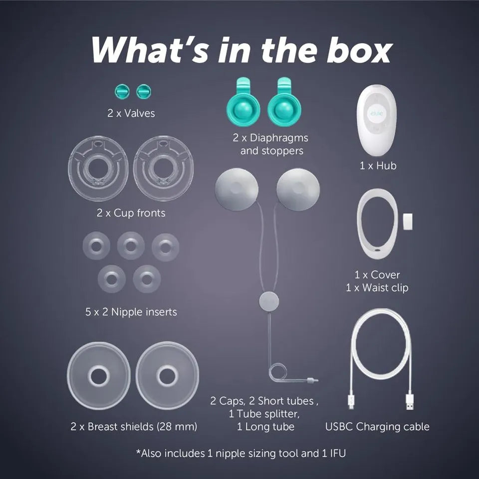 1 hub, 2 cup fronts, 2 breast shields (28mm), 2 caps, 1 nipple sizing tool, 5 Elvie nipple inserts (two each of 15, 17, 19, 21, and 24mm), 1 tube splitter, 2 short tubes (for the cups), 1 long tube (for the hub), 1 cover, 2 valves, 2 diaphragms and stoppers, 1 charging cable, 1 waist clip, and 1 neck strap.