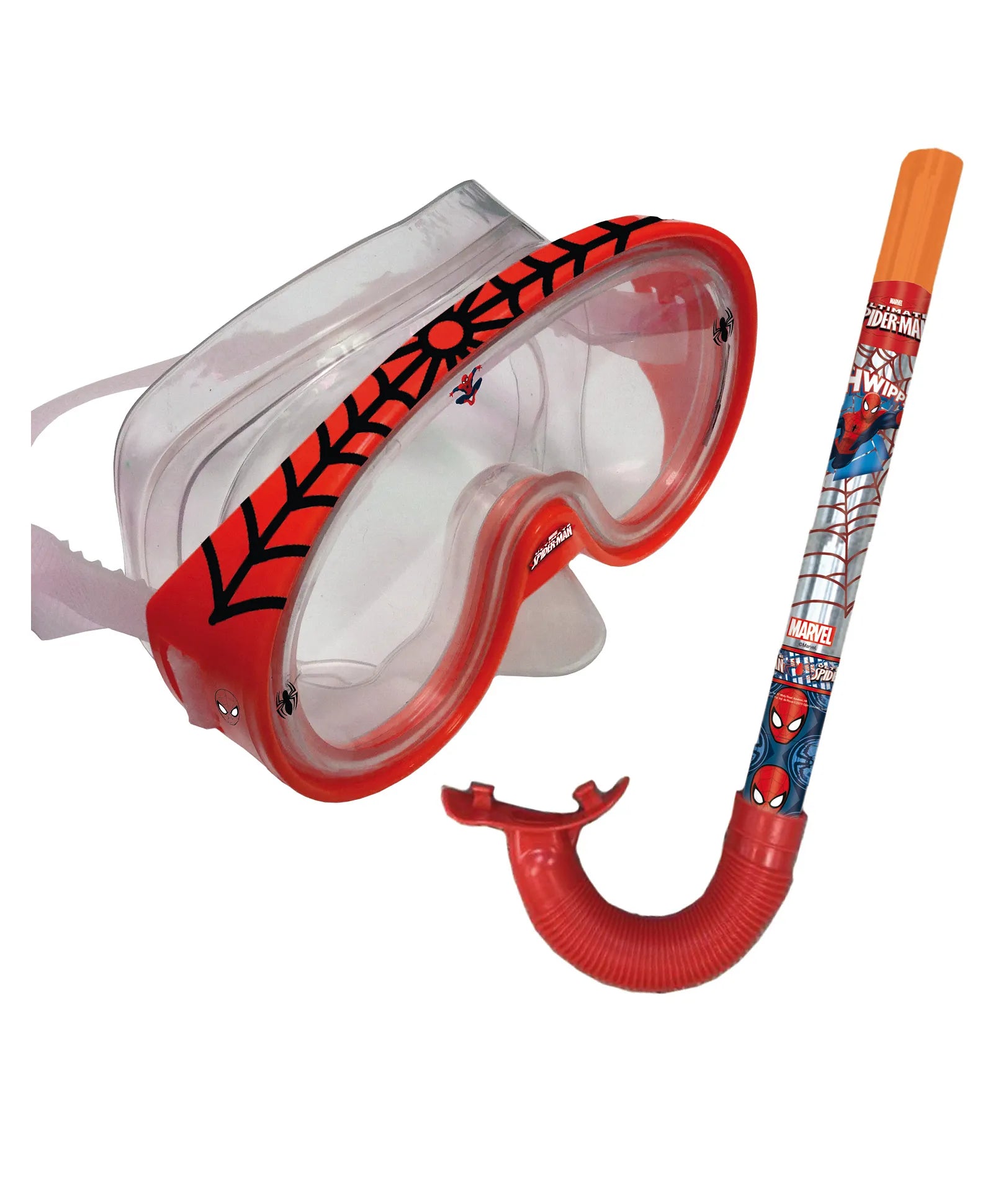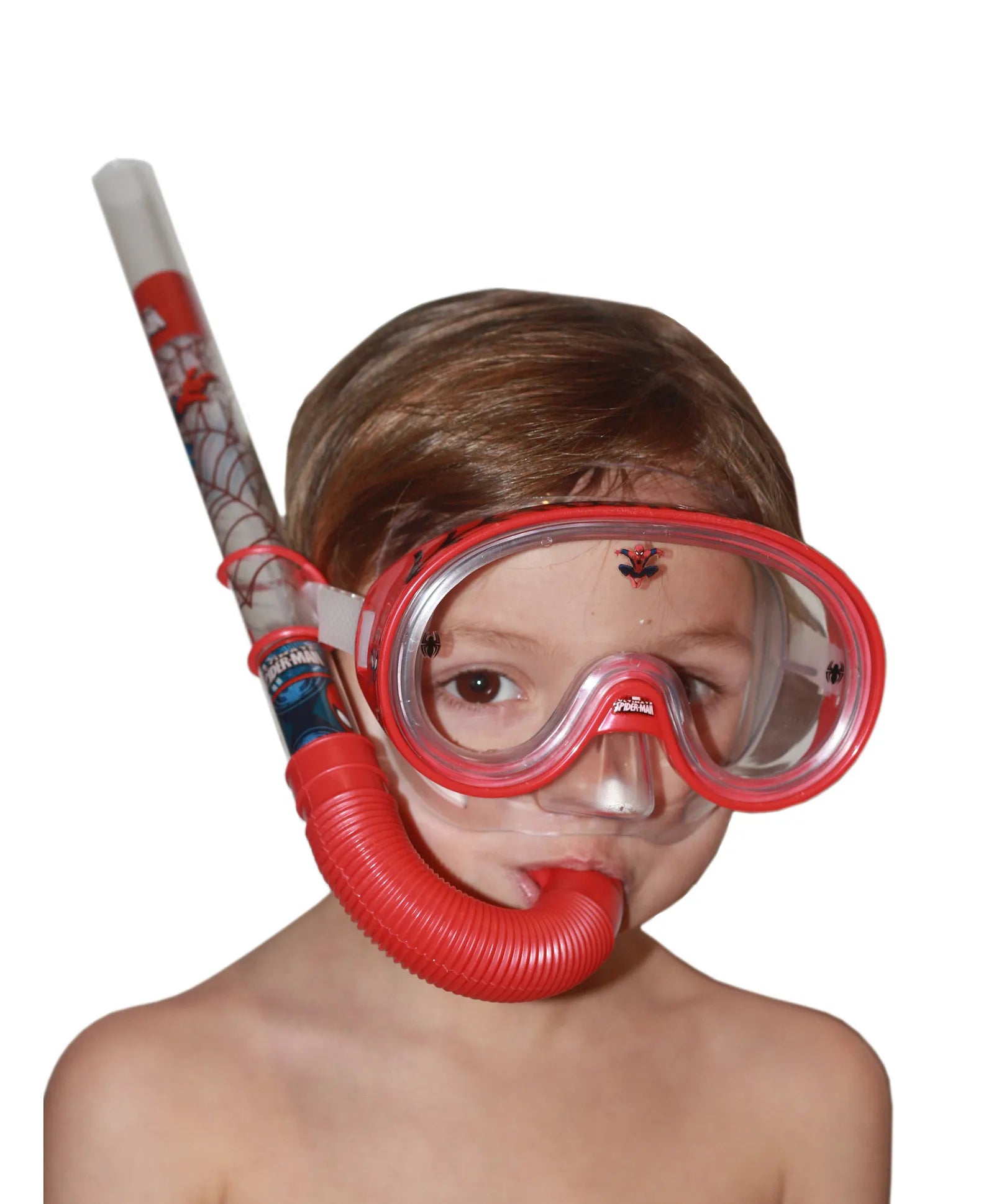 Colourful set for the sea or the swimming pool by Spider-man, with mask and snorkel. The mask has a soft transparent silicone face piece, the tube has a flexible part to adapt to the physiognomy of the face, and is equipped with an anatomical silicone mouthpiece. The edge of the mask is in rigid red plastic, embellished with graceful images of Spider-Man in different poses. The tube is made of resistant transparent plastic.