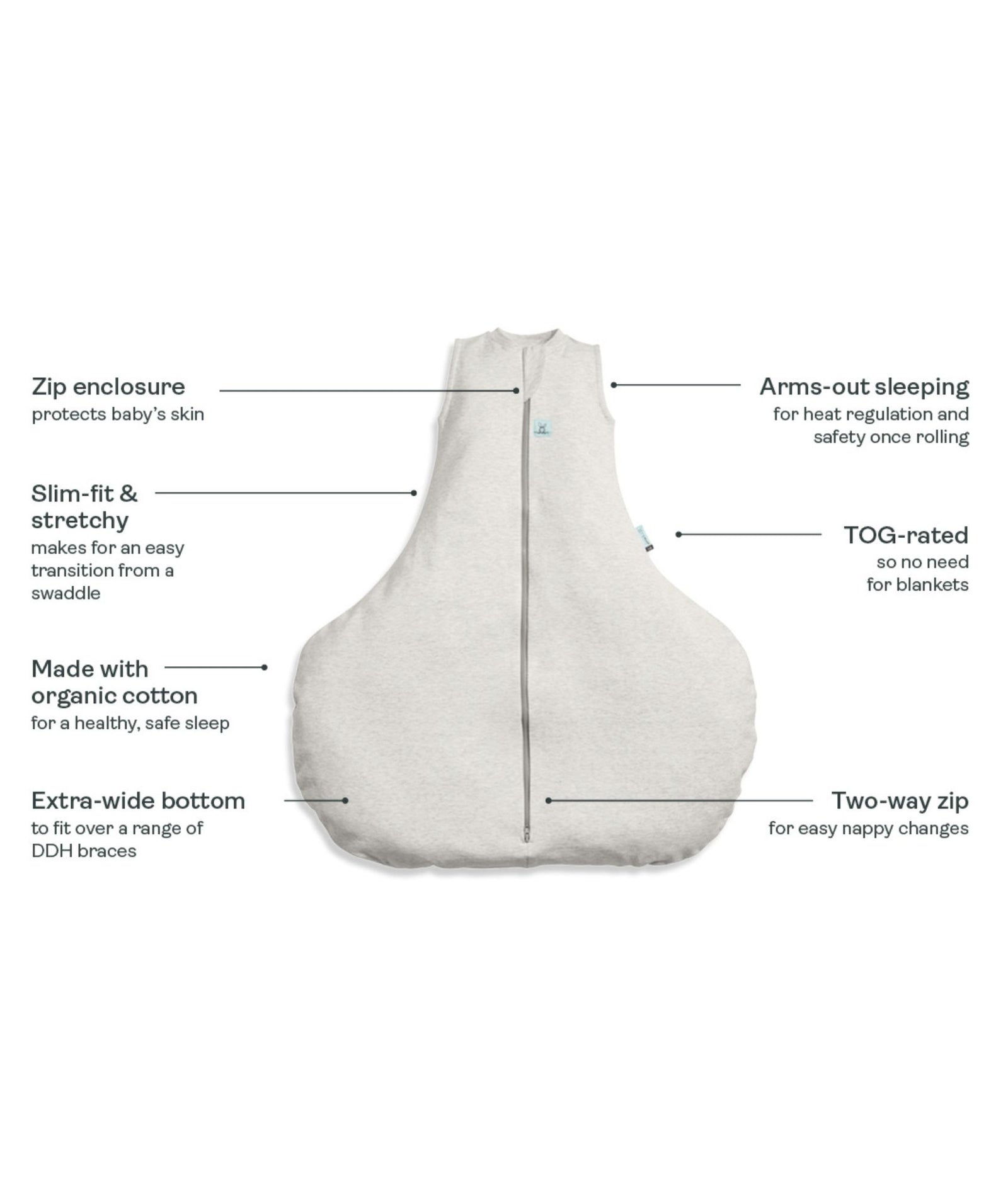 Parents can choose to have their baby's arms inside the swaddle (if your child has a strong startle reflex), or to open the poppers on the shoulder and use as an arms-out sleeping bag. When on your child, the swaddle will have additional length below the harness. This length can be left as is, or rolled up underneath the harness for your child's brace to rest on if that's comfortable for them. Once your child is out of their brace, they can continue to safely use the Hip Harness Cocoon Swaddle Bag for sleep until they are ready to move into another one of our Sleeping Bags. The Cocoon Swaddle Bag is made from GOTS certified organic cotton, and bamboo, with a touch of elastane. This means it's firm enough to restrict startle reflex whilst still allowing stretch and movement for healthy growth.