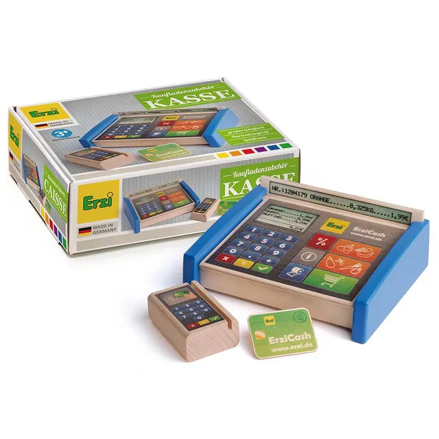 An absolute must for use with the Grocery Shop is the modern gaily coloured checkout till constructed of wood featuring a large-sized print imitation touchpad and a spacious compartment for play money.A separate EC card reader enables a supplied credit card to be swiped or ? Bang up to date ? Simply placed on the reading device in the very same way as proper grown-ups go shopping.Money-handling skills and working with figures serve to train motor and mental capabilities.