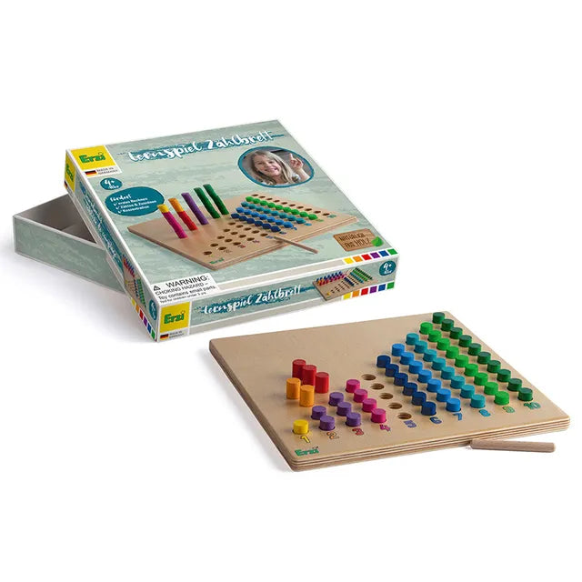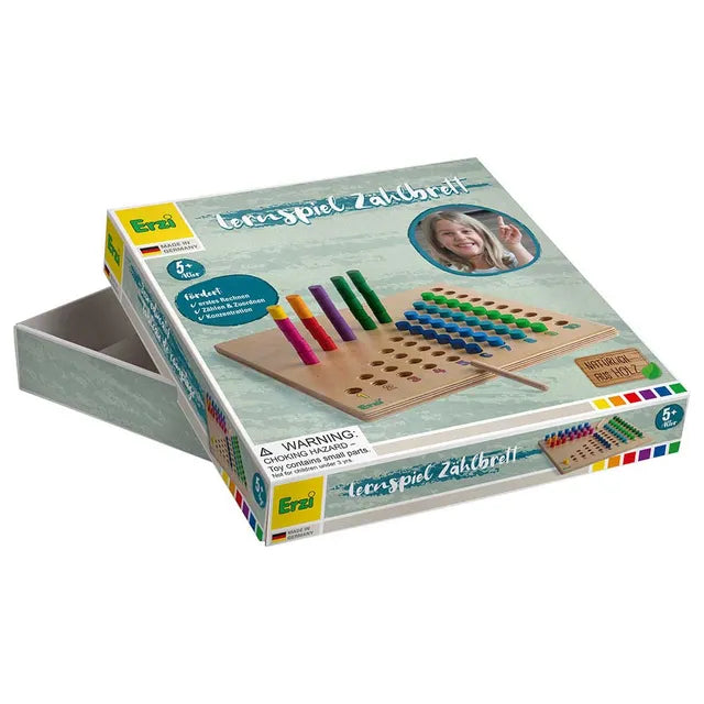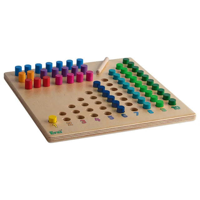 This counting board supports the learning of numbers from 1 to 10. You can insert the right number of small cylinders above the printed numbers. The colour assignments are especially helpful. Simple addition and subtraction tasks can also be performed and double-checked with ease. Content: 55 coloured cylinders, 1 counting stick, 1 board (25 x 25 cm), instructions.