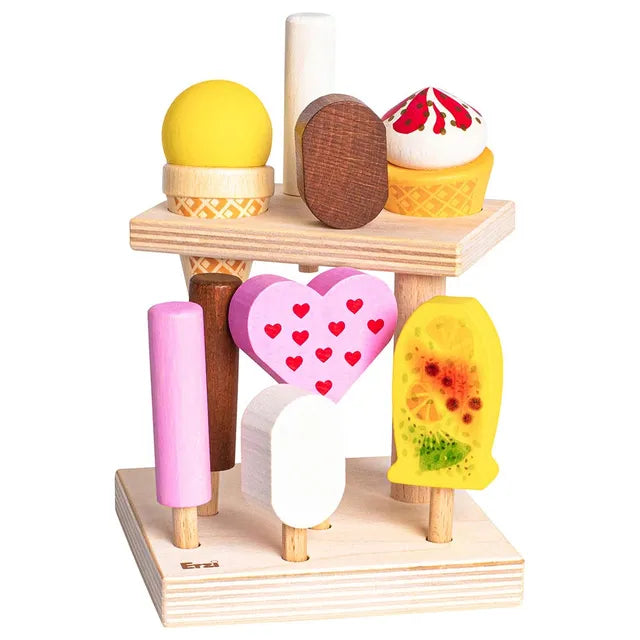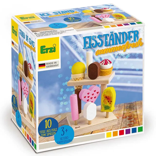 Ice cream stand with 9 different types of Erzi Ice Cream. Contents: 10 pieces of wood1 ice stand, 1 Chocolate Ice Cream, 1 Vanilla Ice Cream, 3 Milky Sticks, 1 Ice Lolly Fruit , 1 Soft Ice Cream, 1 Ice Lolly Raspberry, 1 Ice Cream Cone, Yellow.