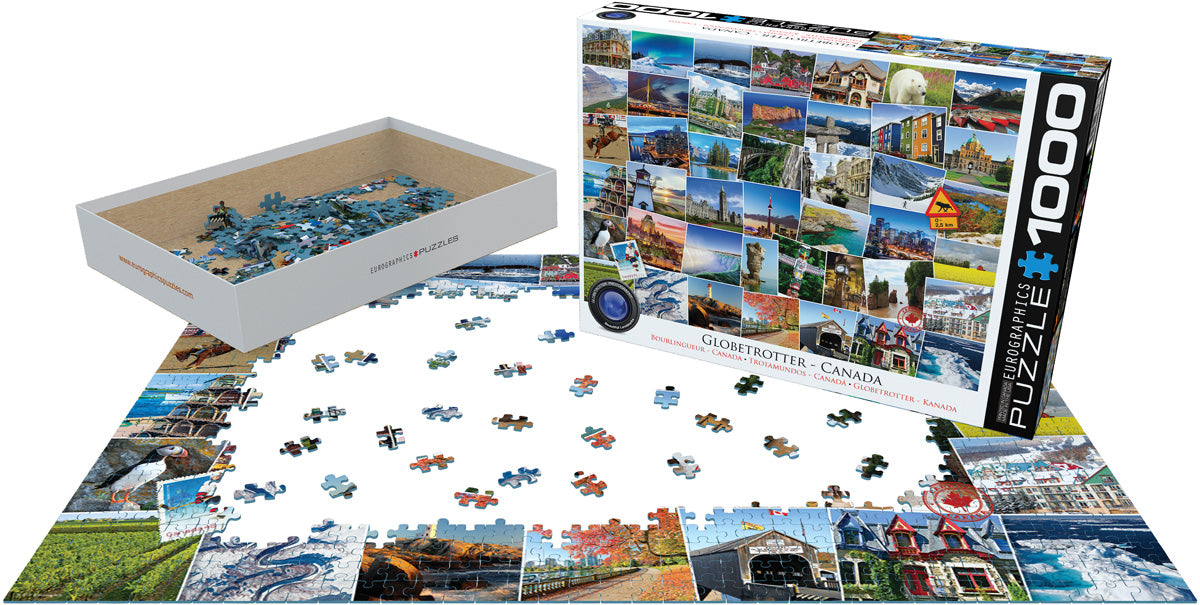 EuroGraphics Canada Globetrotter 1000-Piece Puzzle. Box size: 10" x 14" x 2.37". Finished Size: 19.25" x 26.5". Oh Canada! Learn about landmarks from sea to sea covering one of the worlds most beautiful (and nicest) countries! Strong high-quality puzzle pieces. Made from recycled board and printed with vegetable based ink. This superior quality puzzle will delight and educate all at the same time.