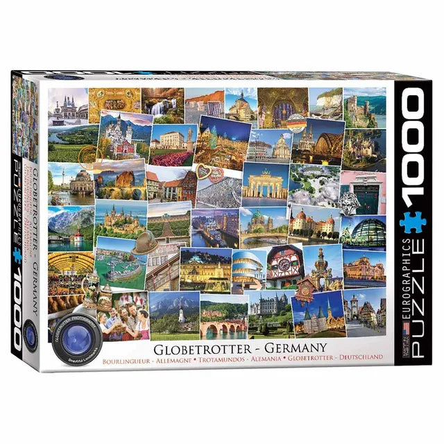 EuroGraphics Globetrotter Germany 1000-Piece Puzzle. Box size: 10" x 14" x 2.37". Finished Puzzle Size: 19.25" x 26.5". Itƒ??s a small world after all. Your passport to the best of Germany in one puzzle, over 40 destinations to view. This 1000 piece puzzle is sure to give you the travel bug as you will want to book your flight today! Strong high-quality puzzle pieces. Made from recycled board and printed with vegetable based ink. This superior quality puzzle will delight and educate all at the same time.
