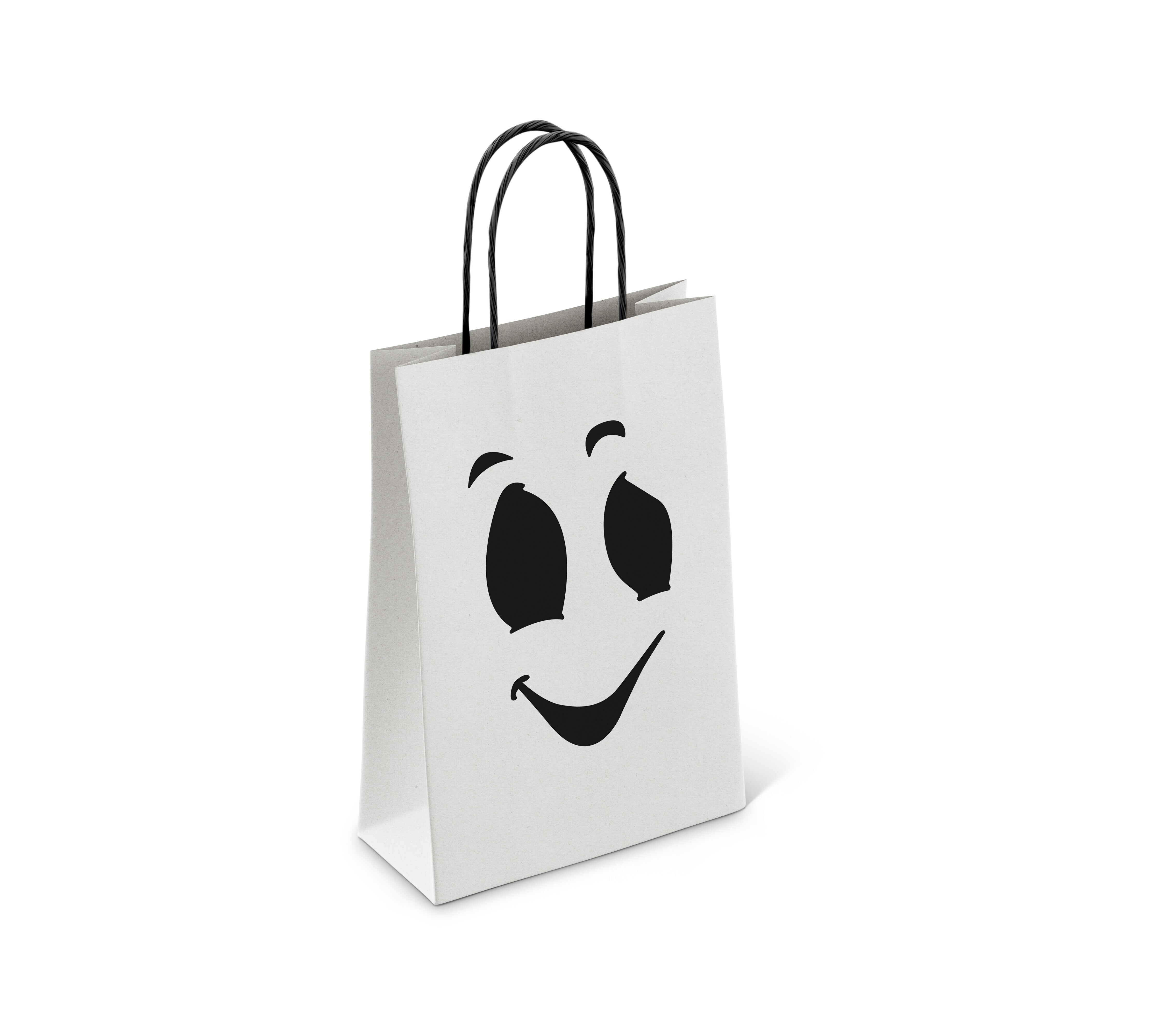 - SET OF 4 HALLOWEEN TREAT BAGS – Includes four printed paper bags with twisty handles in two assorted Halloween designs