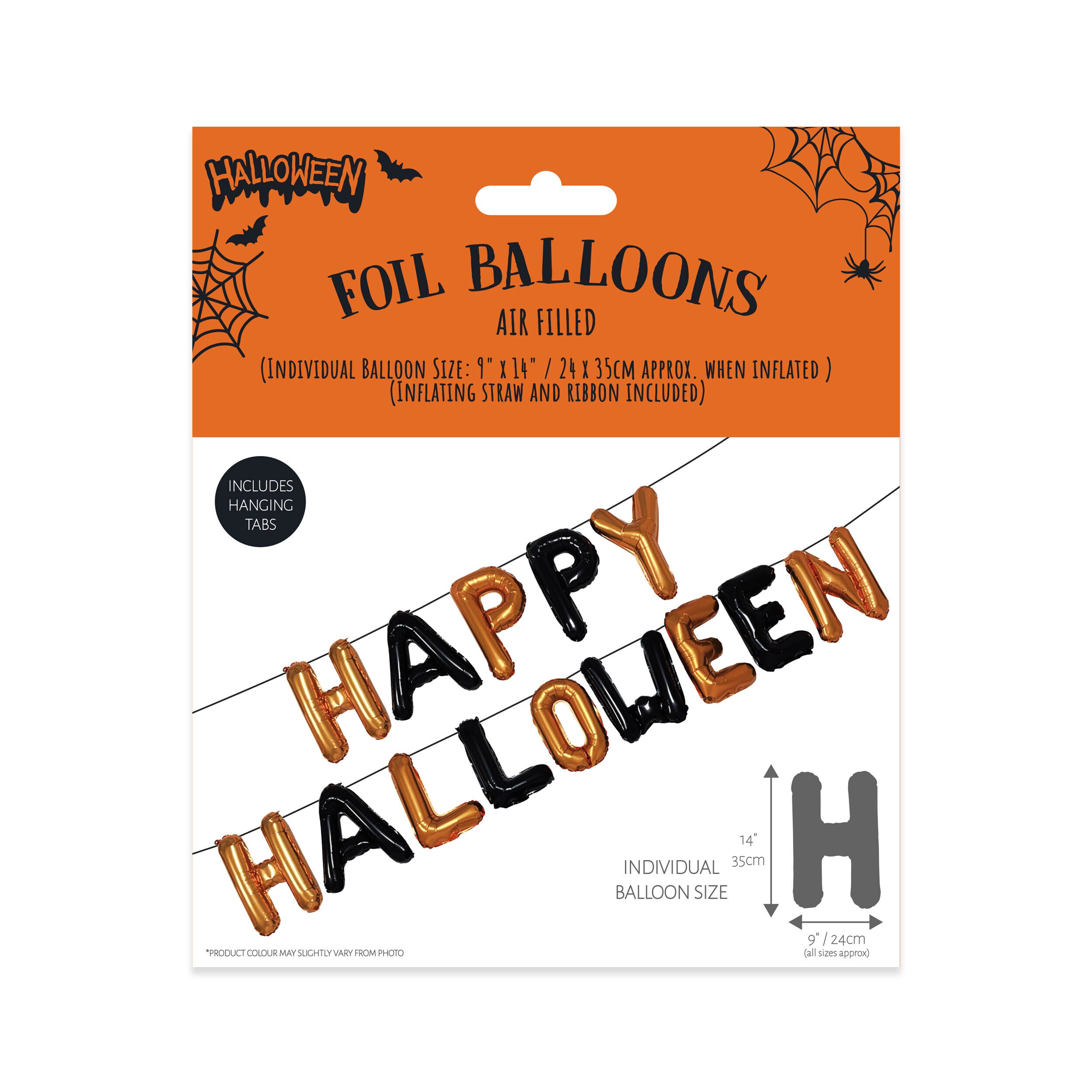 Make your Halloween celebration pop with this eye-catching foil balloon banner! Spelling out Happy Halloween in bold, festive letters, this decoration adds instant charm and spooky flair to parties, storefronts, classrooms, or home setups.
