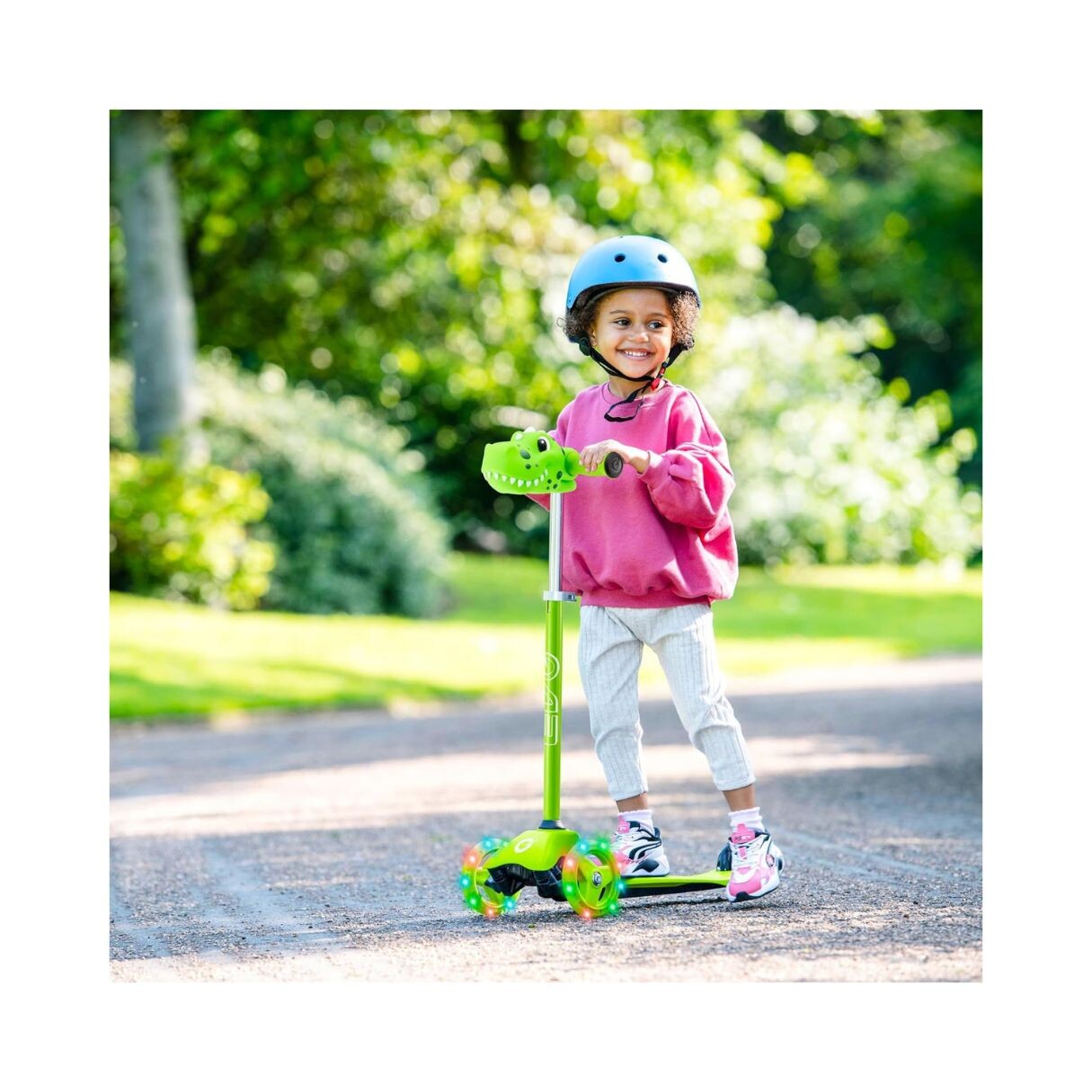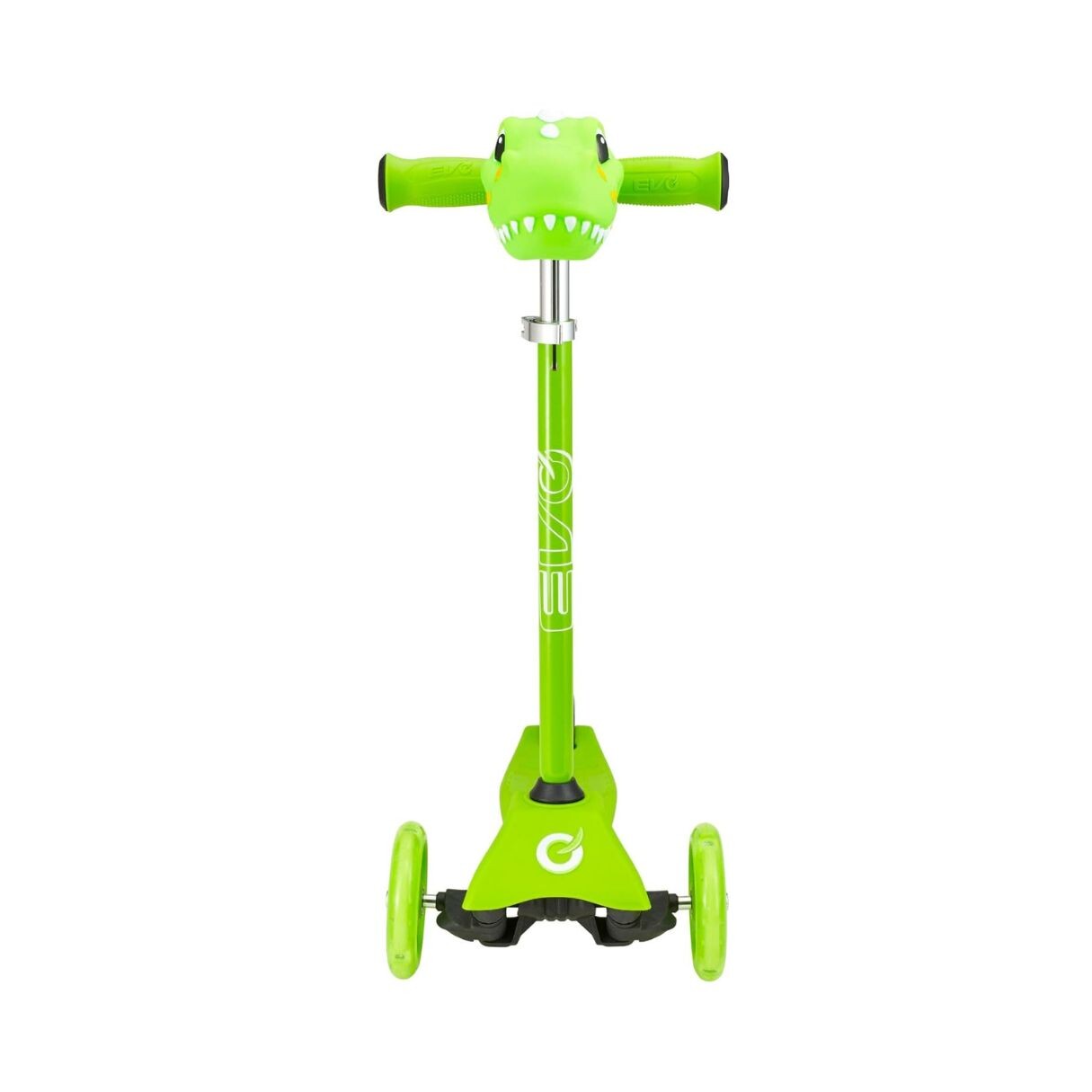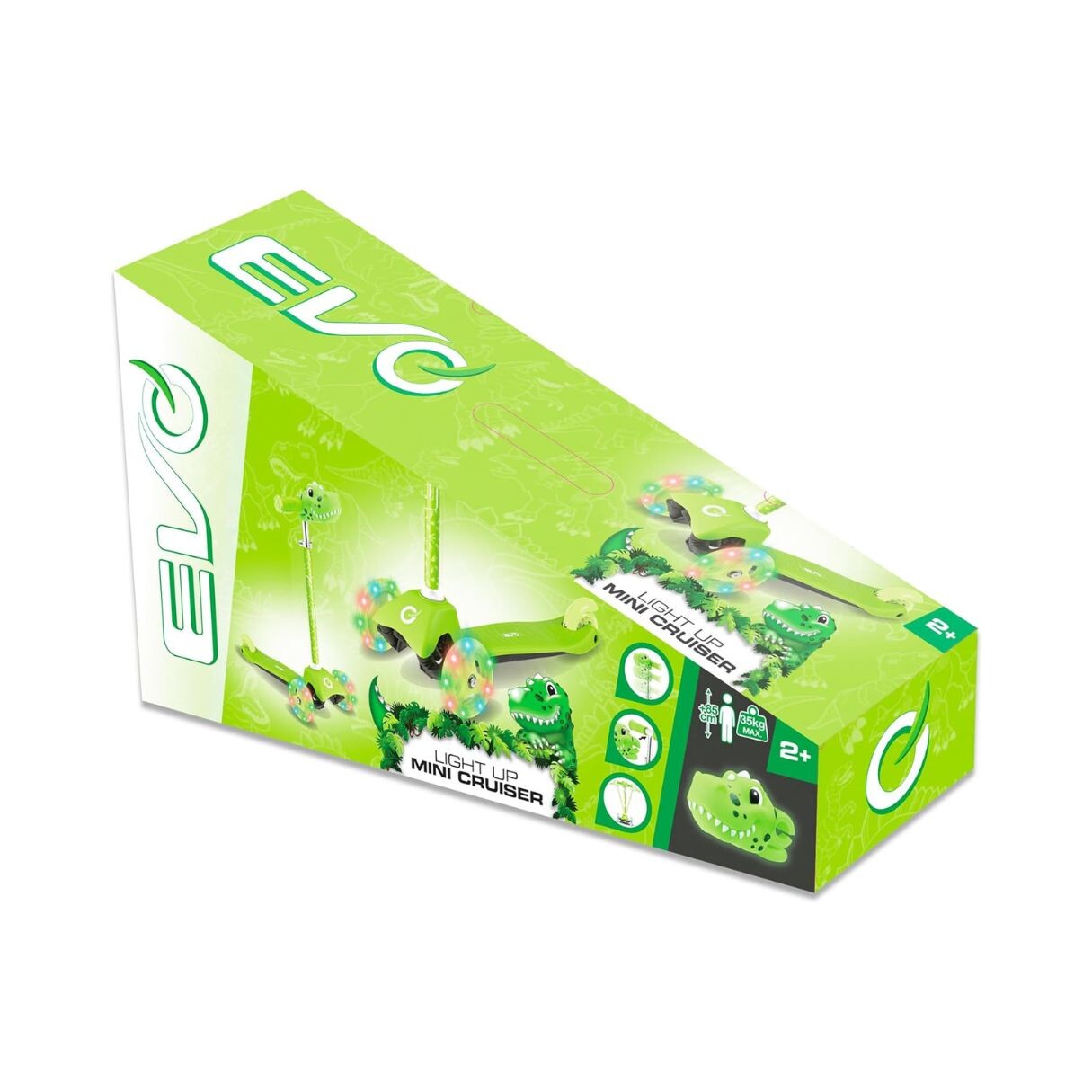 Learn to scoot with the EVO Mini Scooter! Scoot away on this 3 wheel trendy scooter that is perfect for playing out with friends. This kids scooter is designed to help children develop balance and coordination. The two light up 120mm wheels at the front of the scooter provide a sturdy and safe experience, as well as an exciting and thrilling ride! This cool light up mini cruiser features Dinosaur character head that sits on the front of your scooter, ABEC 5 bearings, easy removable T-bar and a rear brake; in addition an adjustable handlebar height of 62-72cm, which is convenient as the scooter will match the growth of your child. Maximum weight 20kg. Suitable for 2 years +