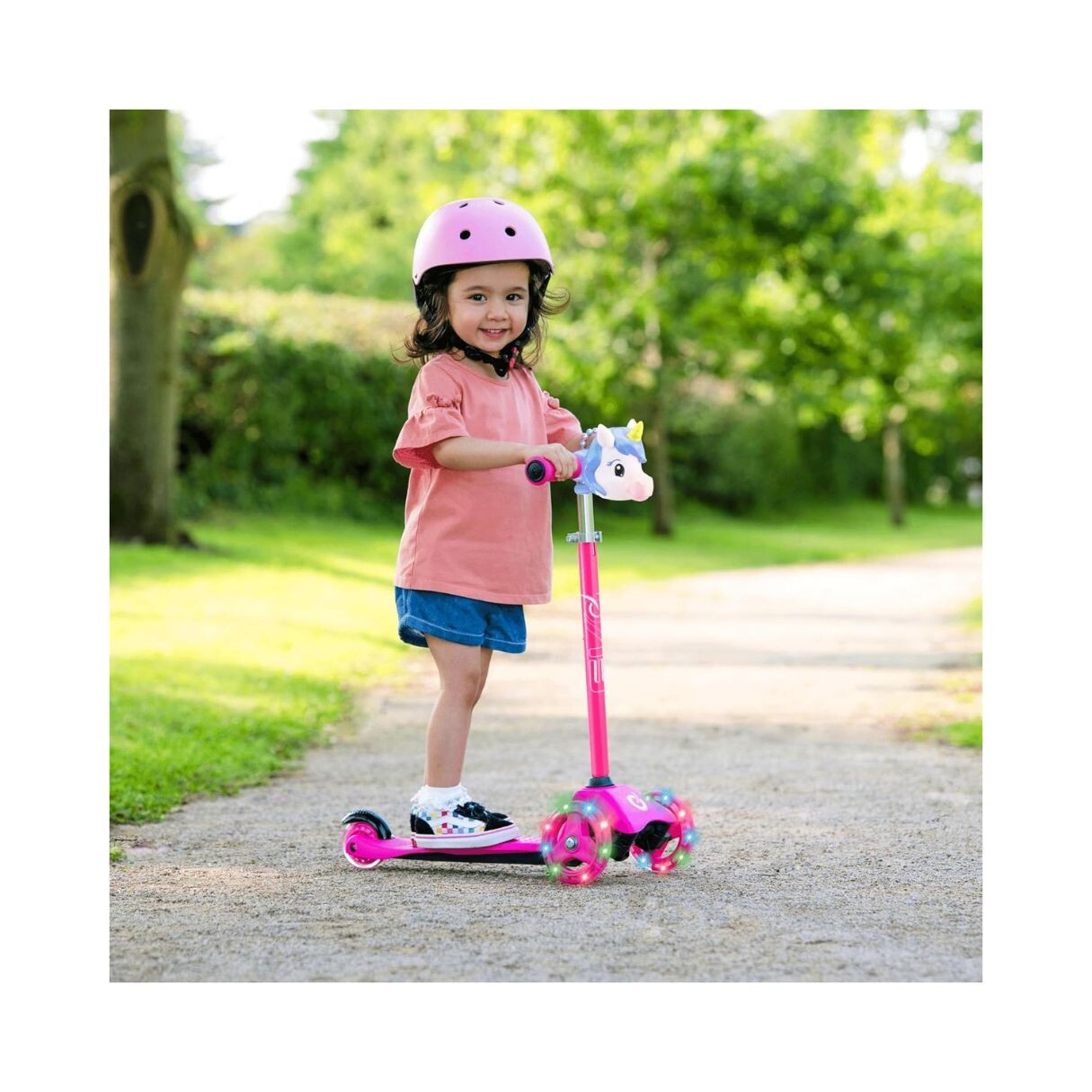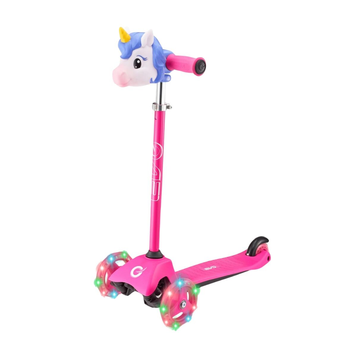 Learn to scoot with the EVO Mini Scooter! Scoot away on this trendy 3-wheel scooter, perfect for playing outdoors with friends. This kids’ scooter is designed to help children develop balance and coordination. The two light-up 120mm wheels at the front provide a sturdy and safe experience, as well as an exciting and thrilling ride! This cool light-up mini cruiser features a Unicorn character head that sits at the front of the scooter, adding a fun and playful touch.