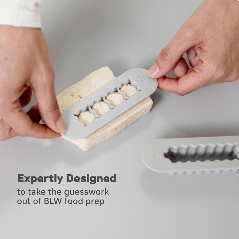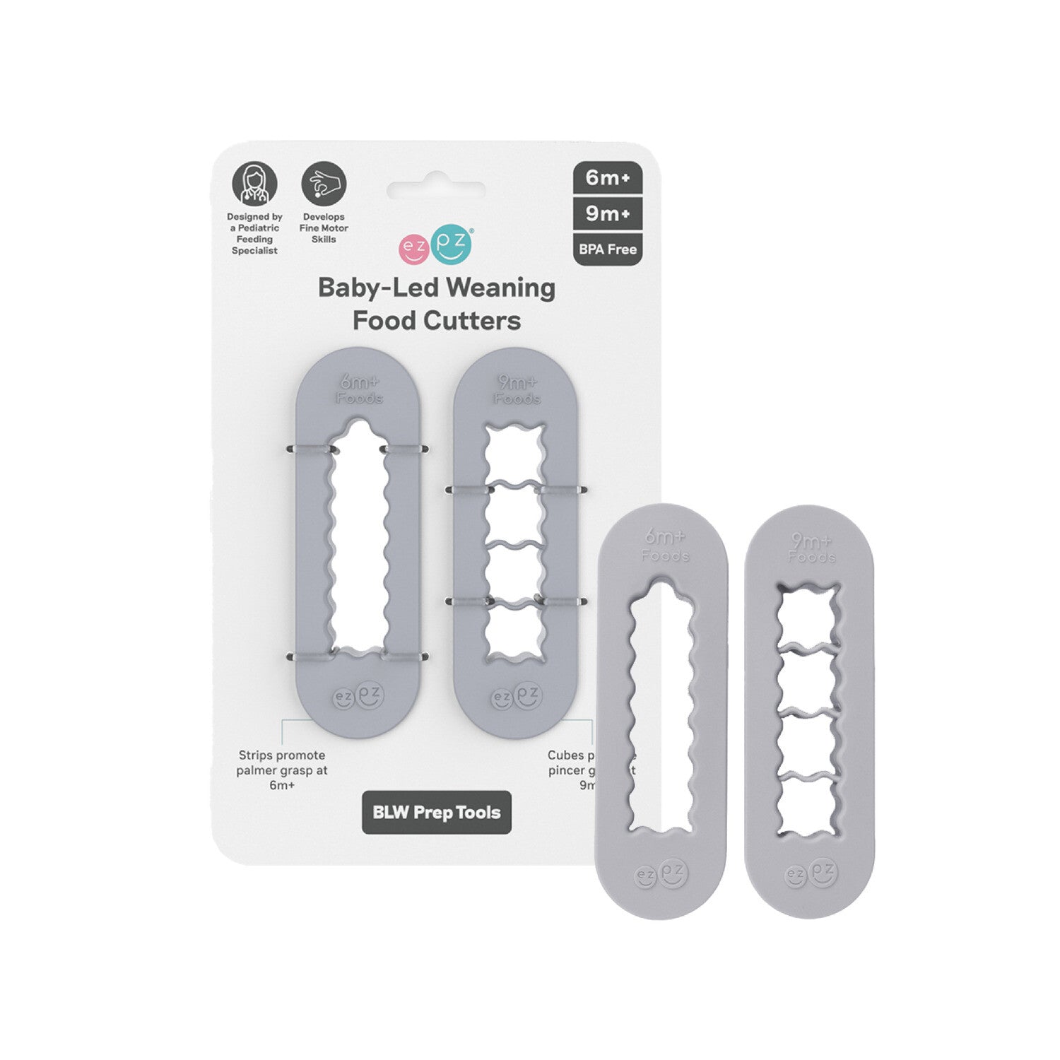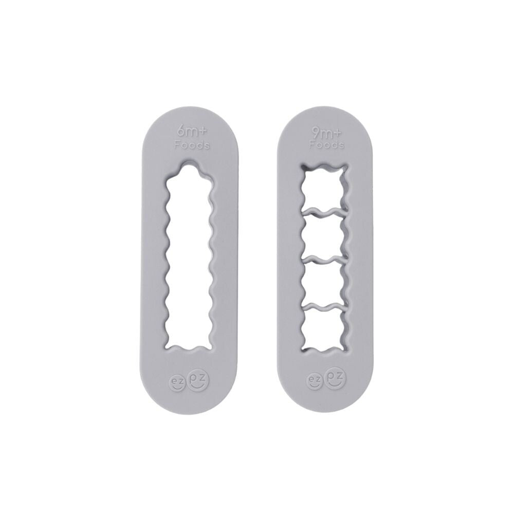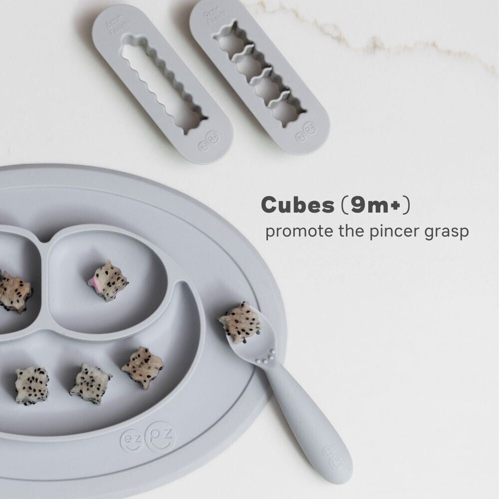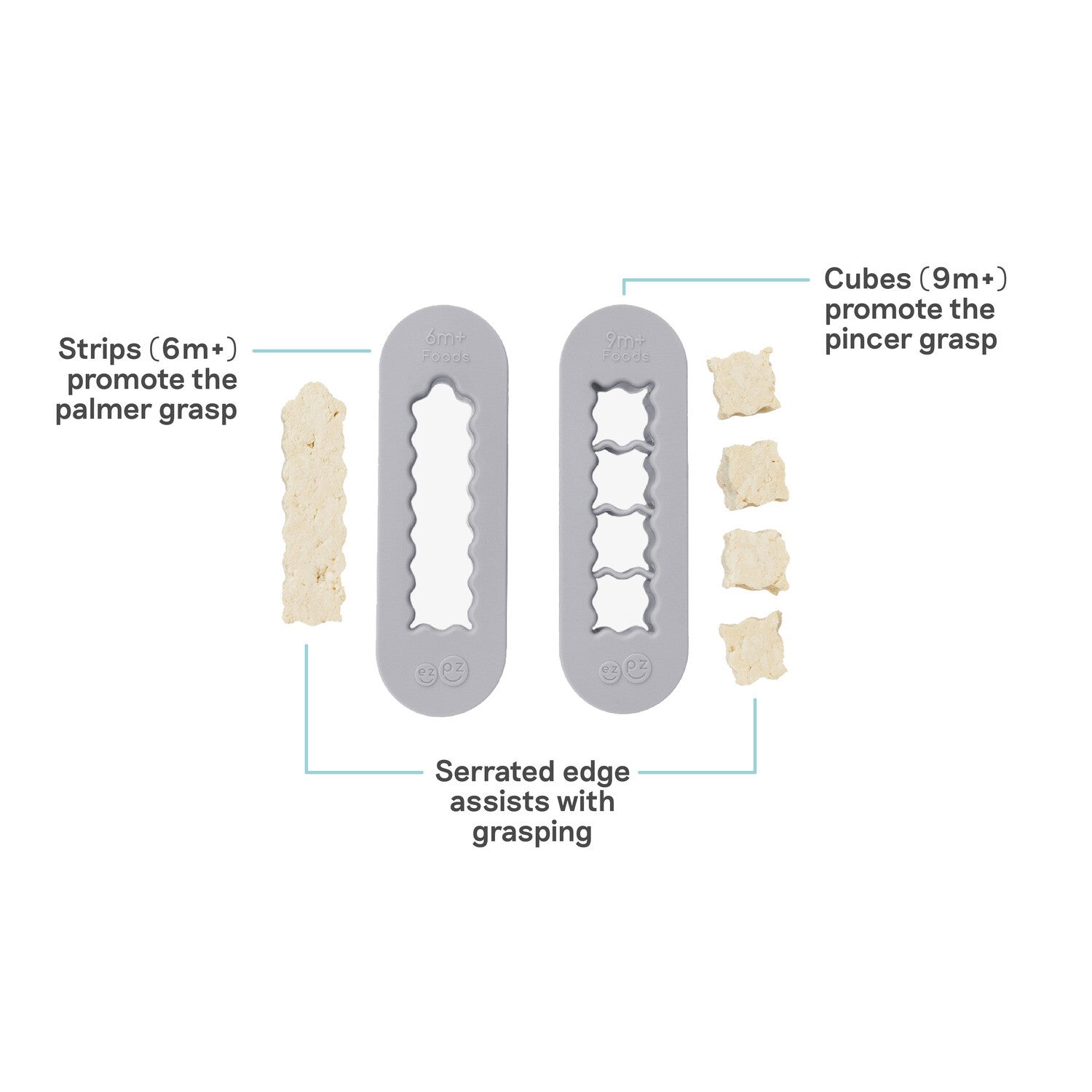The ezpz food cutters make baby-led weaning food prep ezpz! Start with the food cutter for food strips (6m+) to promote the palmar grasp. At 9m+ layer in the cubed food cutter to promote the pincer grasp.