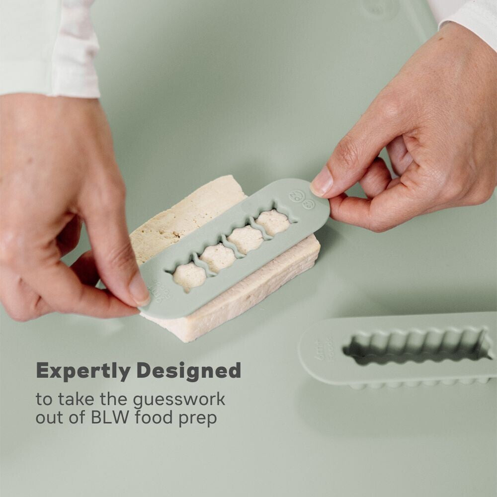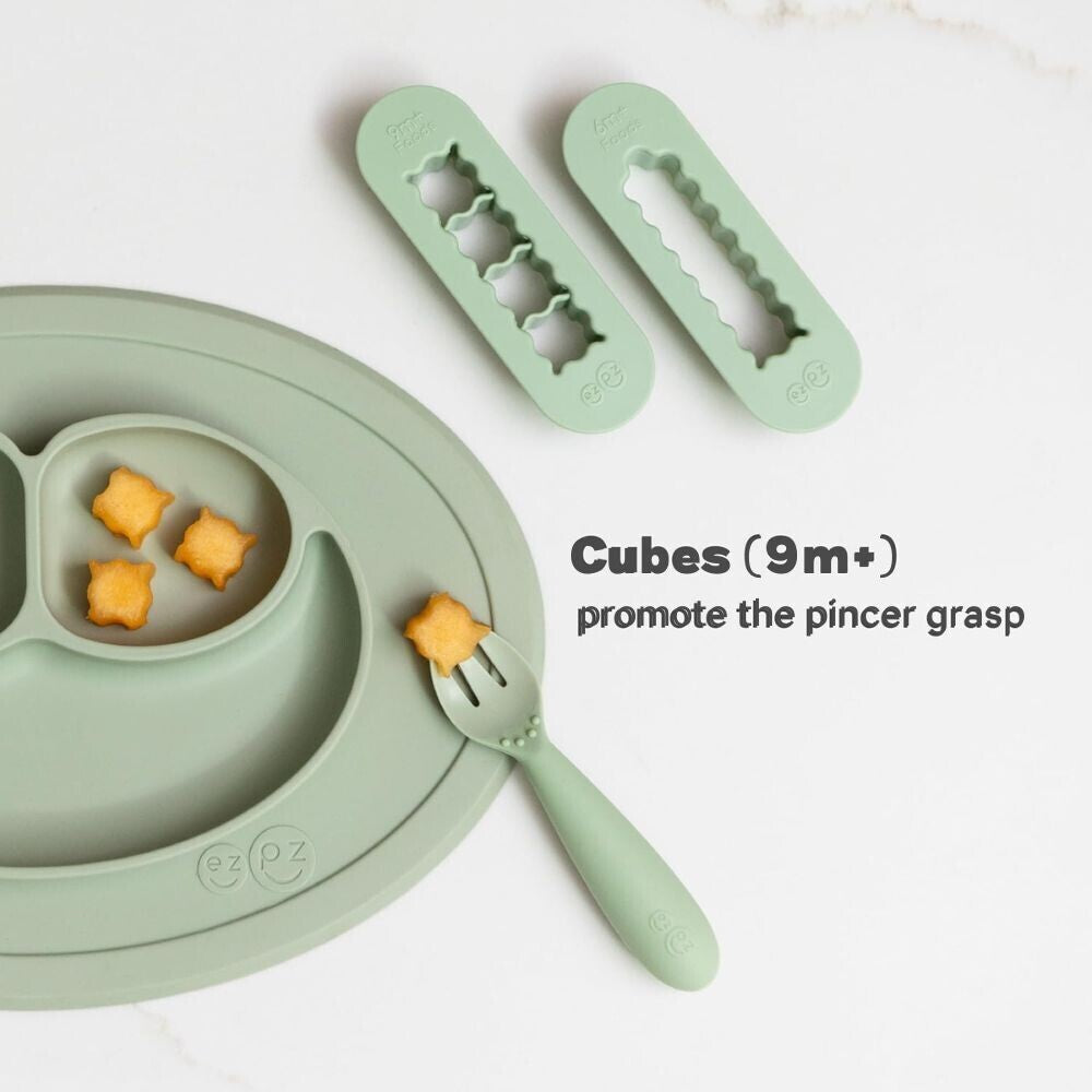 The ezpz food cutters make baby-led weaning food prep ezpz! Start with the food cutter for food strips (6m+) to promote the palmar grasp. At 9m+ layer in the cubed food cutter to promote the pincer grasp.