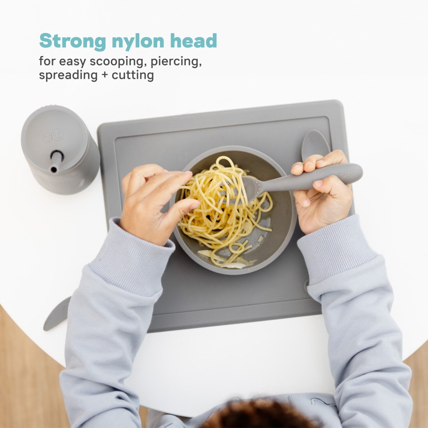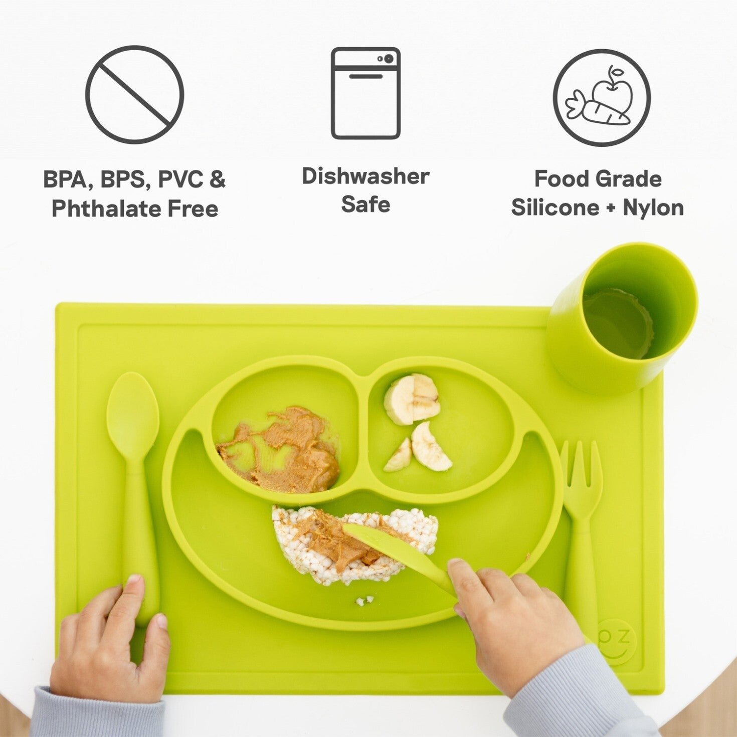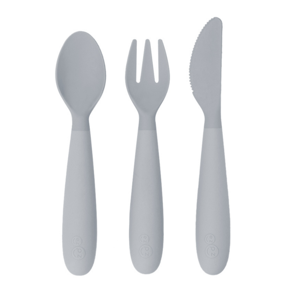 Learning self-feeding skills with utensils is an important developmental milestone. The ezpz Happy Utensils are designed to help older toddlers/preschoolers independently eat with a spoon and fork, and safely practice using a knife (spreading + cutting).