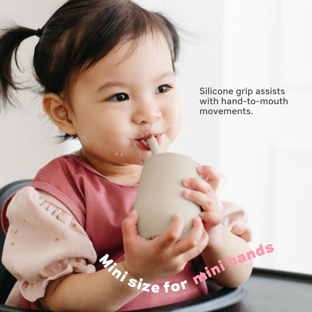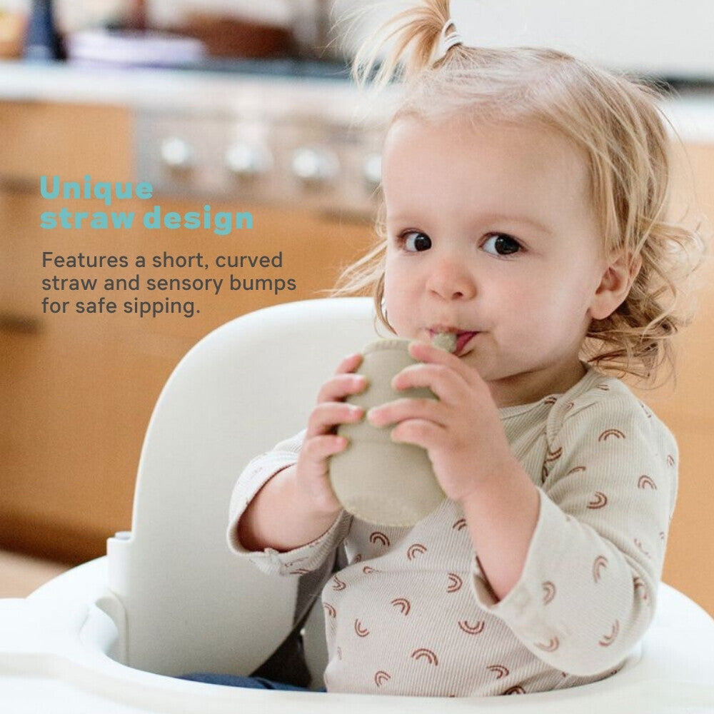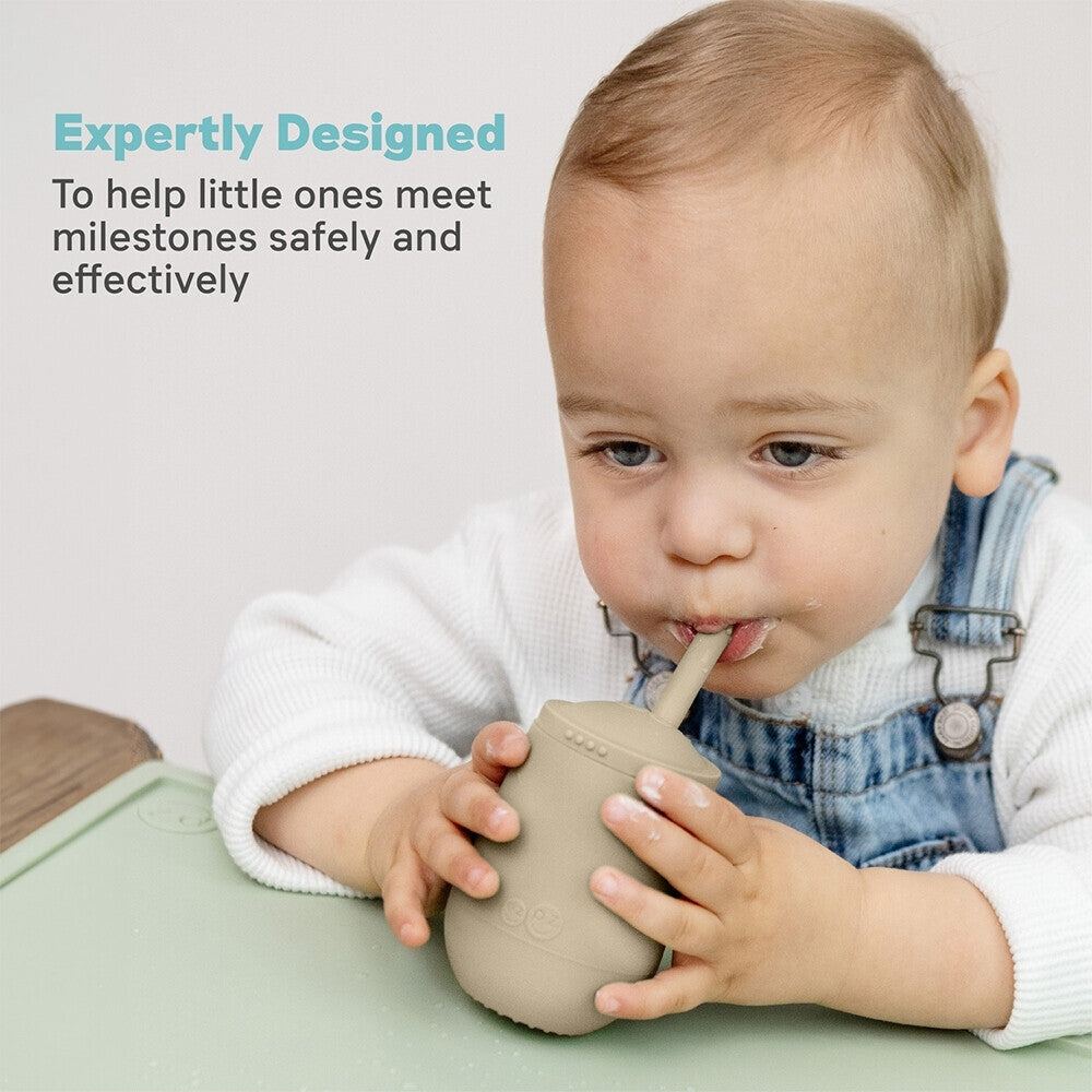 Learning to drink from a straw is an important developmental milestone that develops lip rounding and promotes speech development. The ezpz Mini Cup + Straw Training System teaches toddlers to drink from an open cup and safely learn to use a straw.